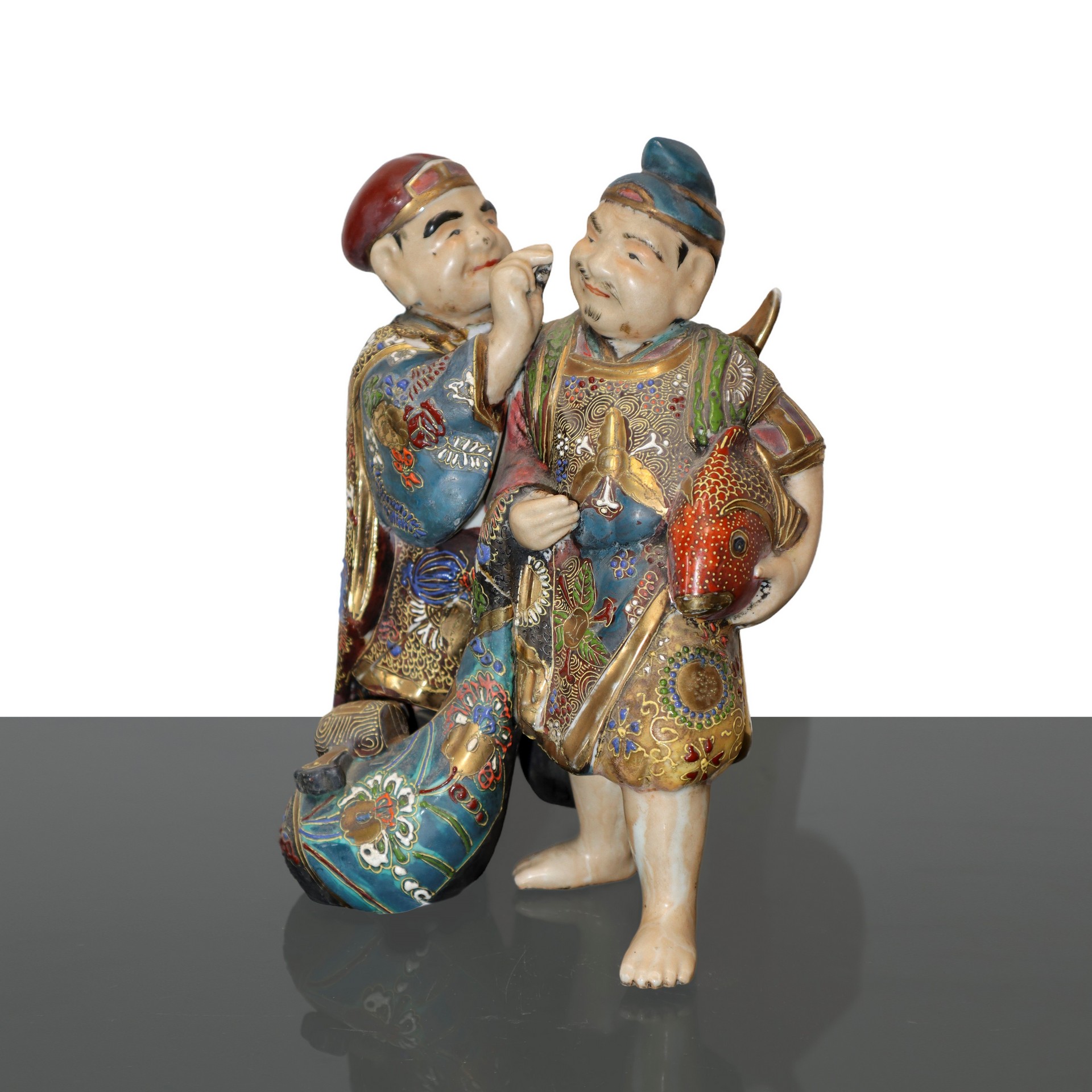 Coppia di figurine giapponesi con dettagli smaltati in blu e oro
