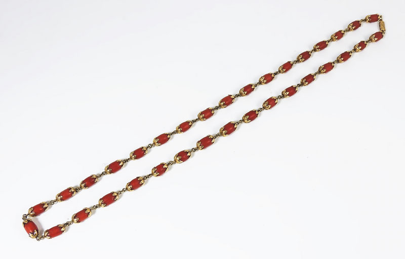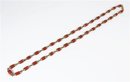 COLLANA IN ORO GIALLO E CORALLO ROSSO realizzata con perle ovali in corallo rilegate con motivo di piccole foglie in oro gr 64 GOLD AND CORAL NECKLACE