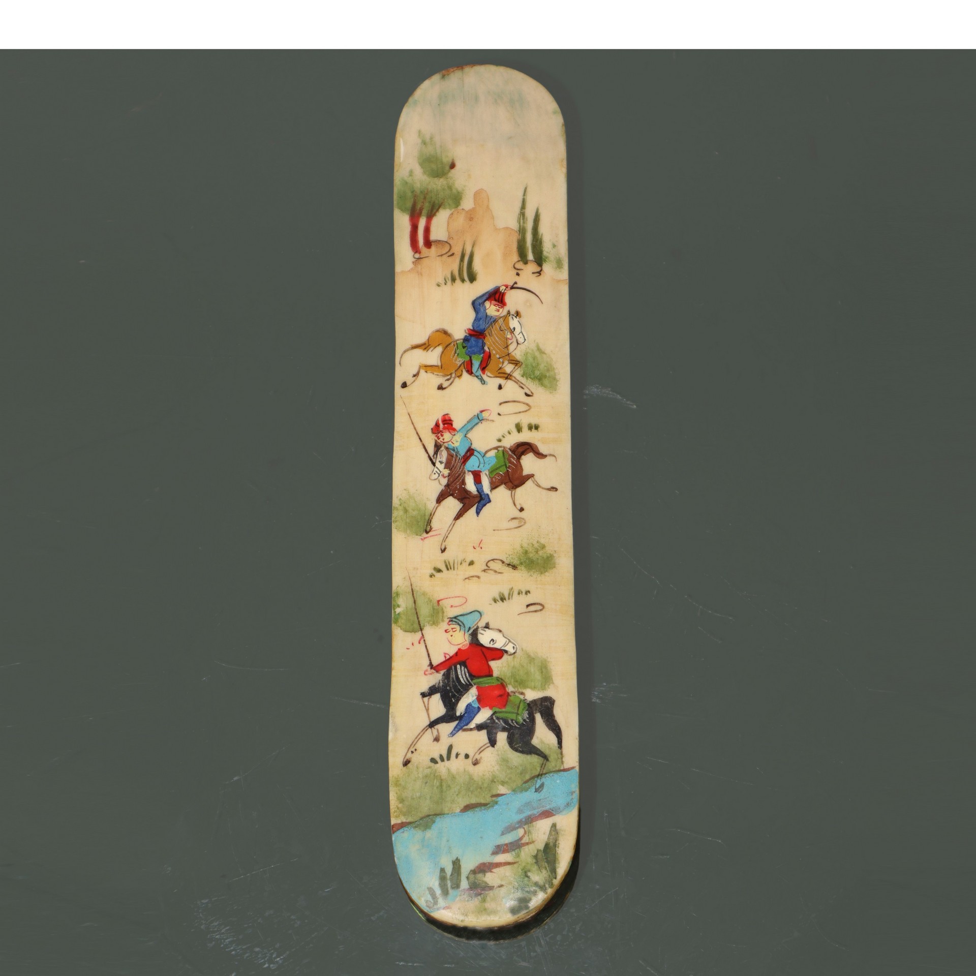 Astuccio orientale in legno con coperchio scorrevole dipinto a mano H cm 3.5x21 Astuccio orientale in legno con coperchio scorrevole, dipinto a mano sui lati con decori nei colori del rosso, verde, nero, bianco, dorato. Decorazione di un paesaggio fluviale con tre uomini a cavallo su un lato dell'astuccio.Astuccio orientale in legno con coperchio scorrevole, dipinto a mano sui lati con decori nei colori del rosso, verde, nero, bianco, dorato. Decorazione di un paesaggio fluviale con tre uomini a cavallo su un lato dell'astuccio.