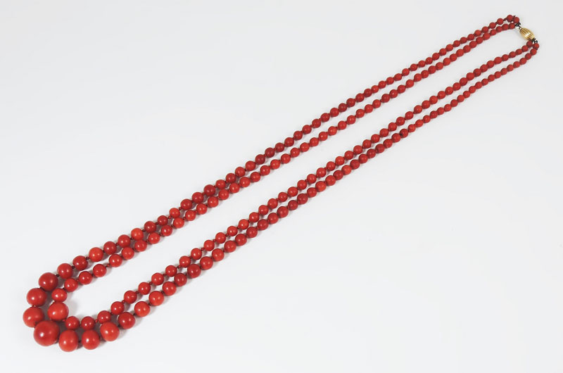 COLLANA A DUE FILI IN CORALLO ROSSO realizzata con chicchi sferici degradè mm...