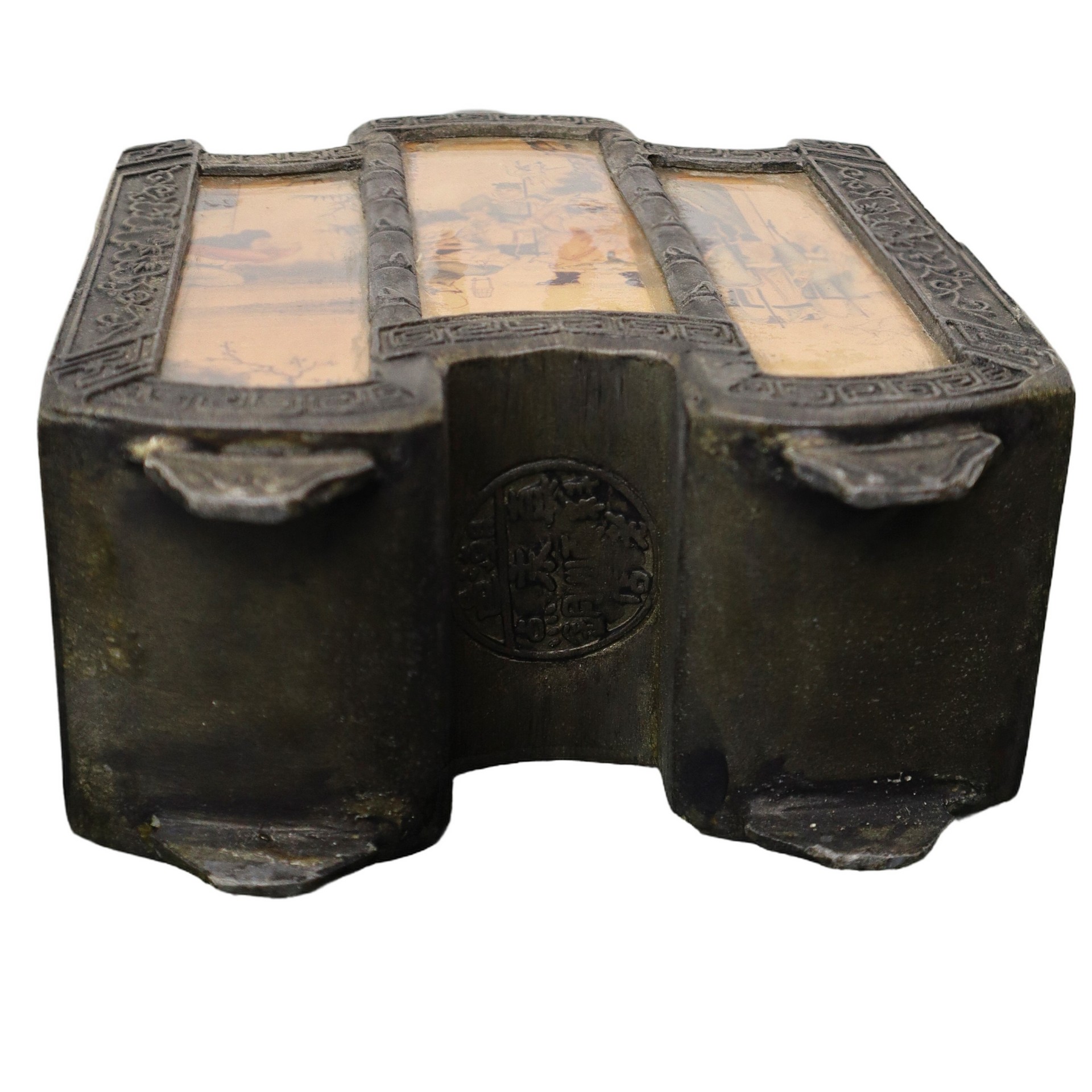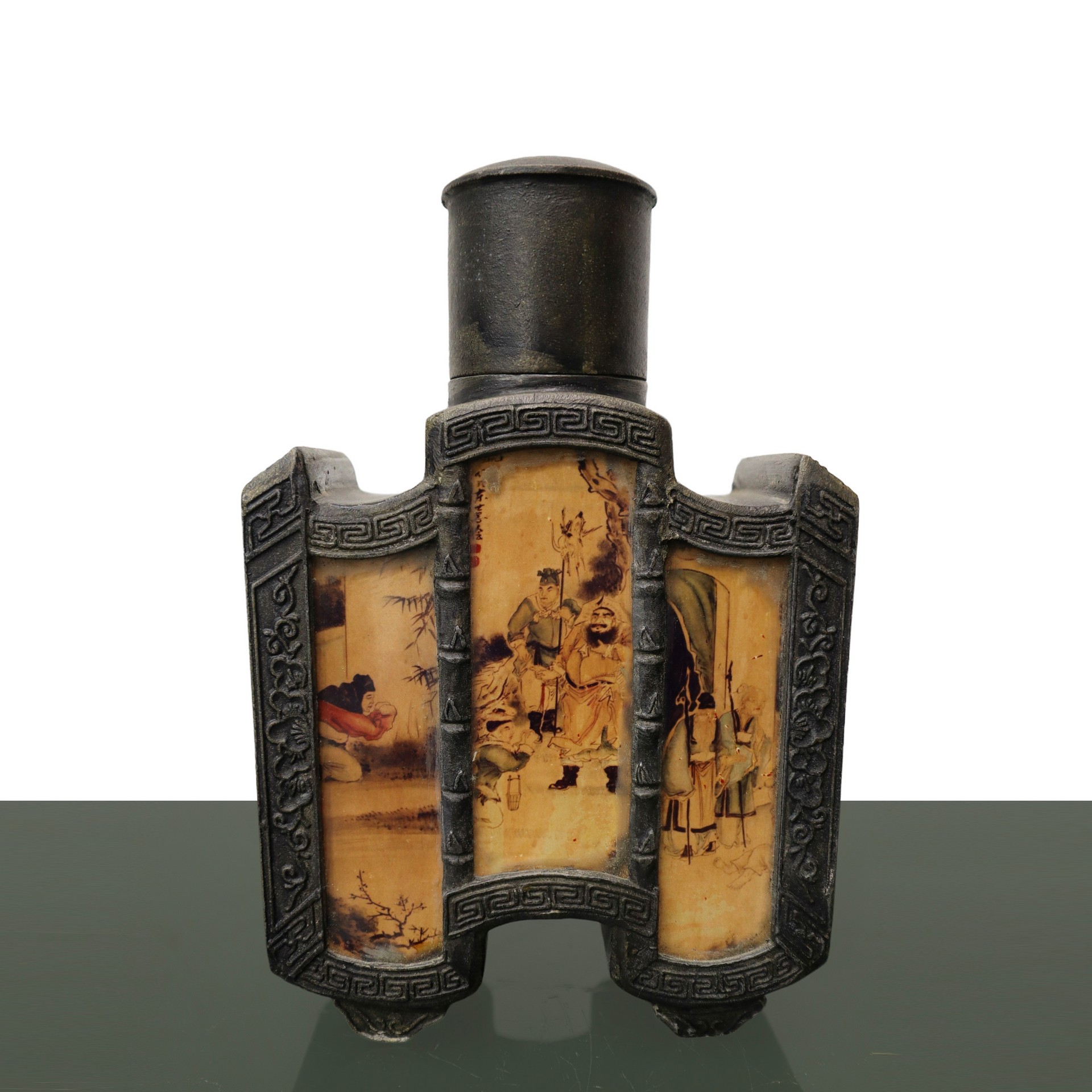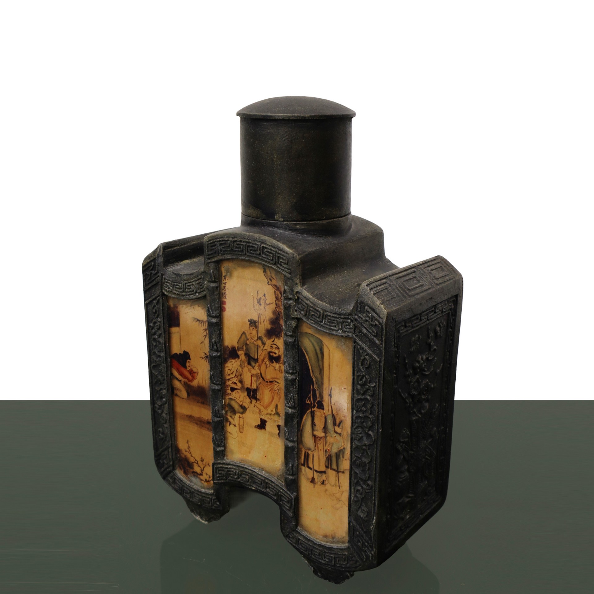 Antico contenitore cinese da te in metallo H cm 11 x16,5 Con scene di genere dipinte a mano. Con scene di genere dipinte a mano.