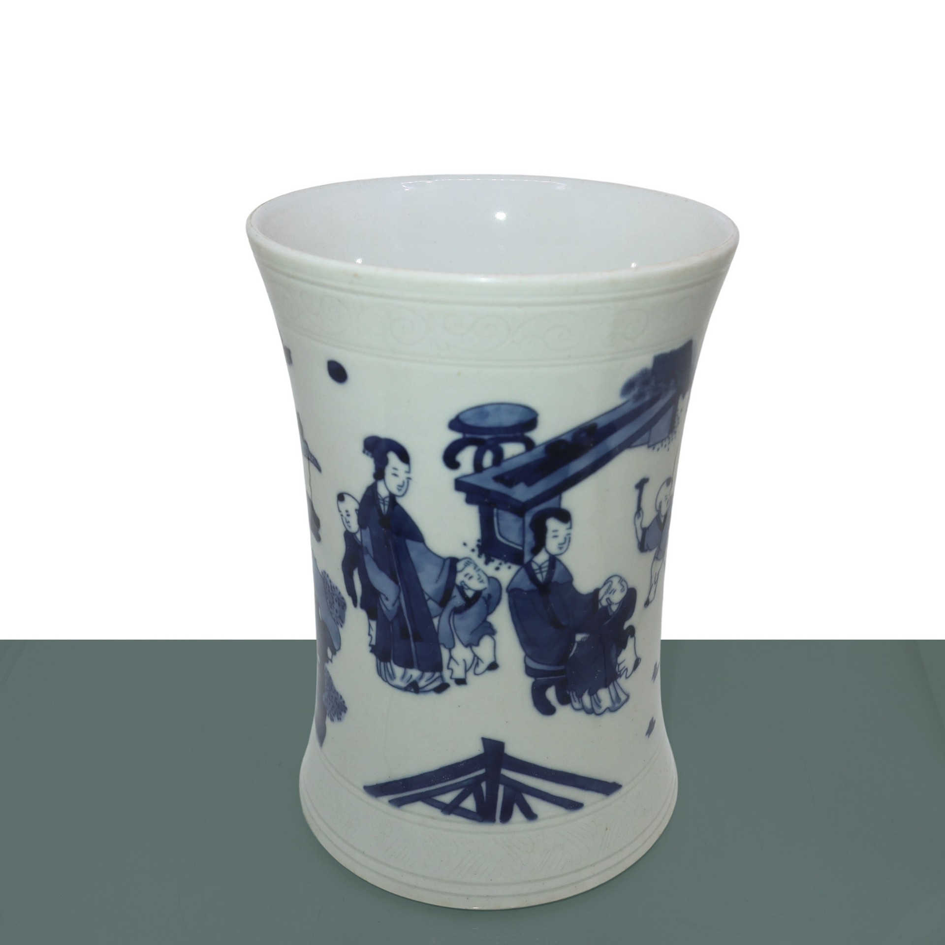 Portapenne in ceramica bianco con decori blu raffiguranti bambini che giocano