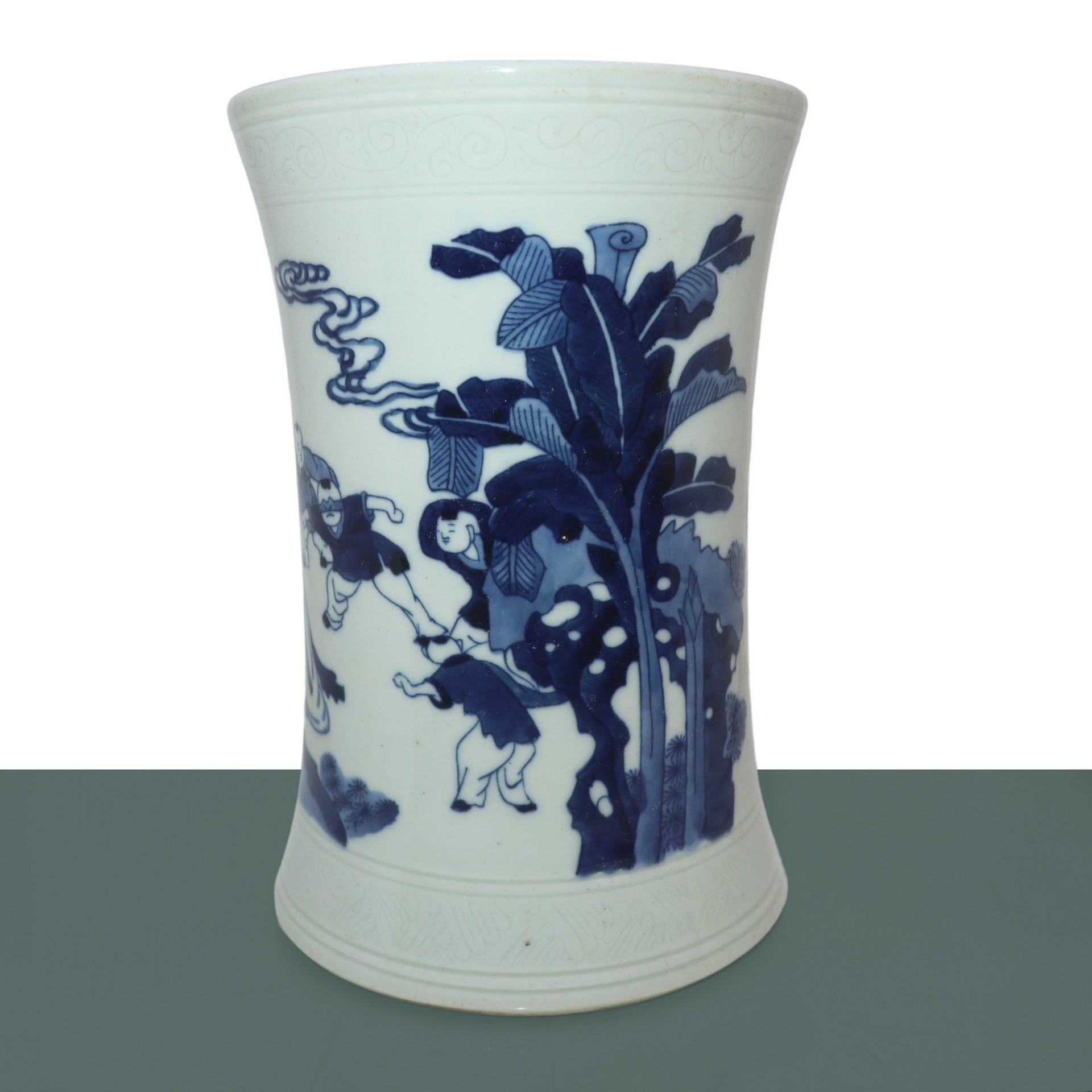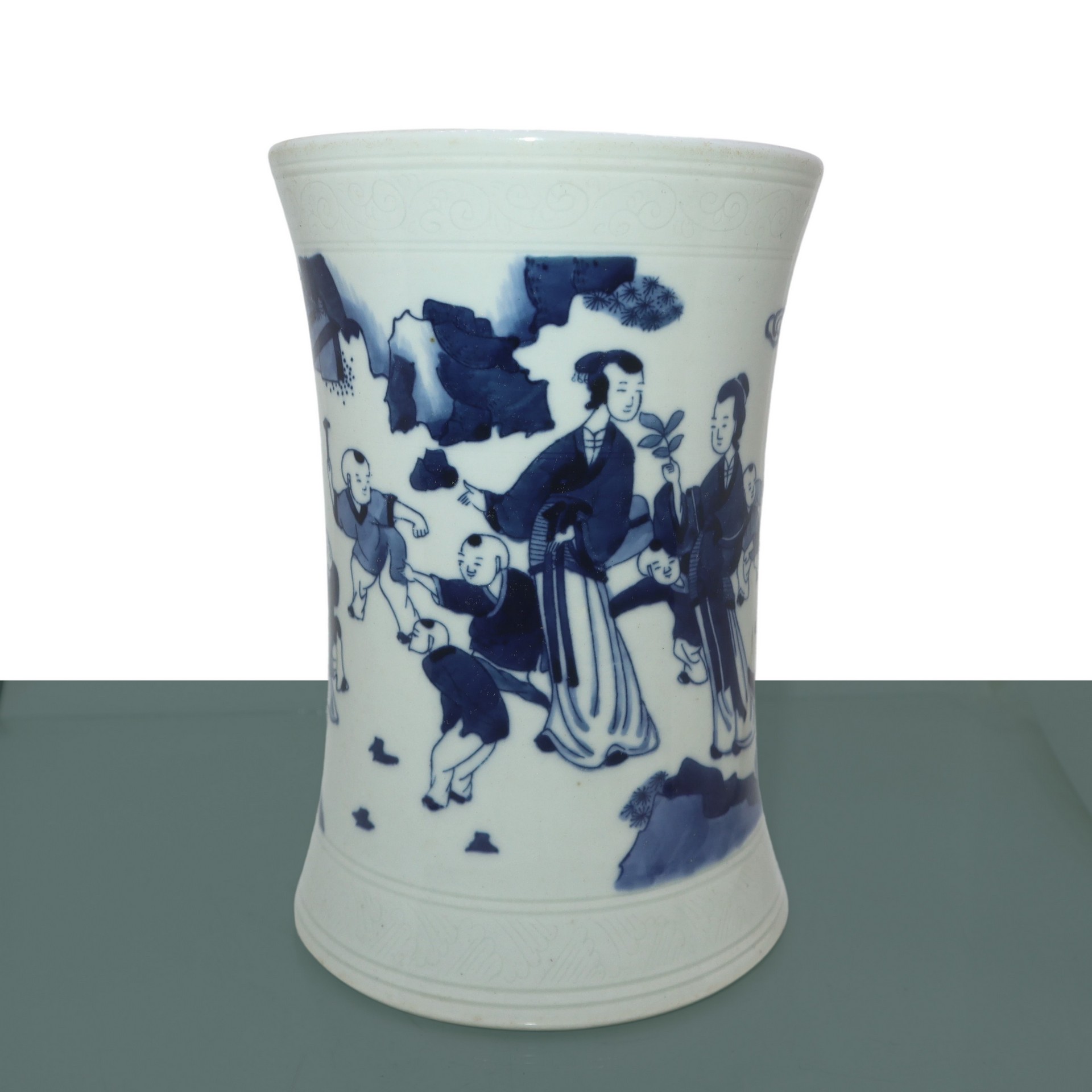 Portapenne in ceramica bianco con decori blu raffiguranti bambini che giocano h 19.5 cm diametro 13,5 cm
