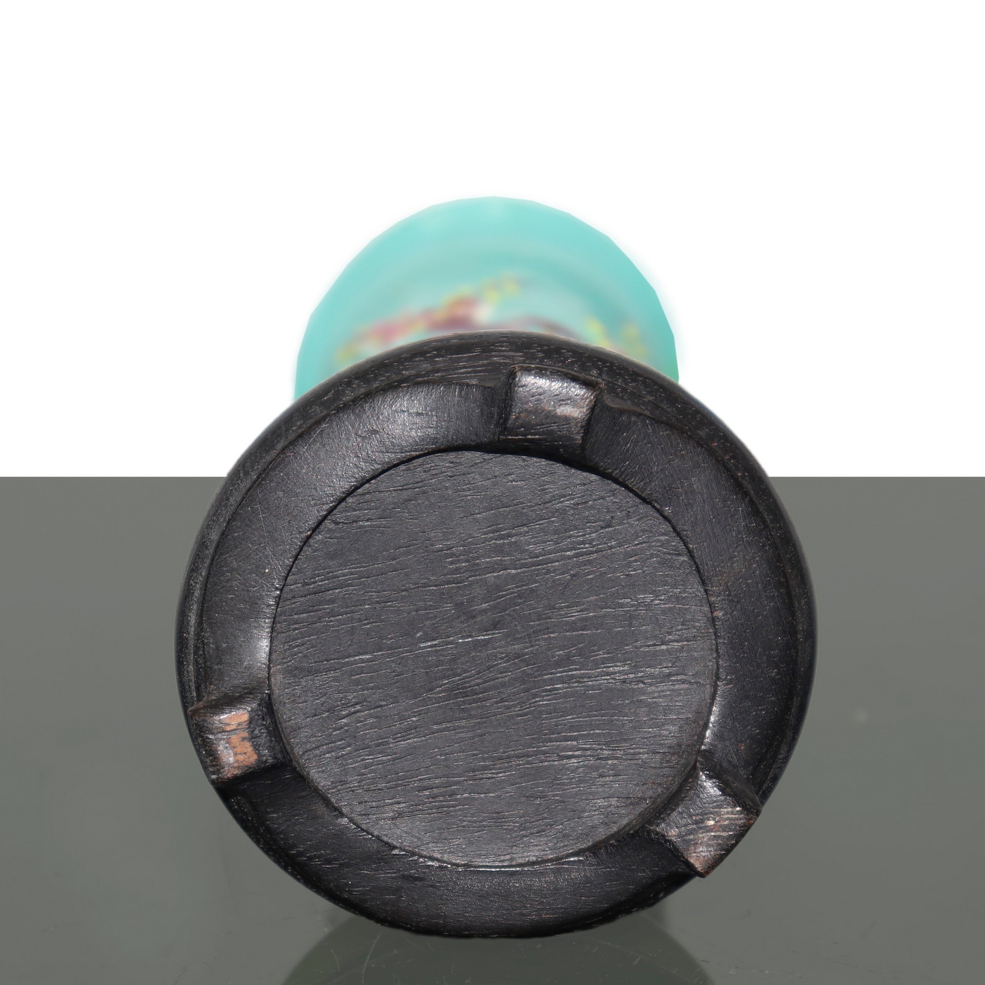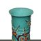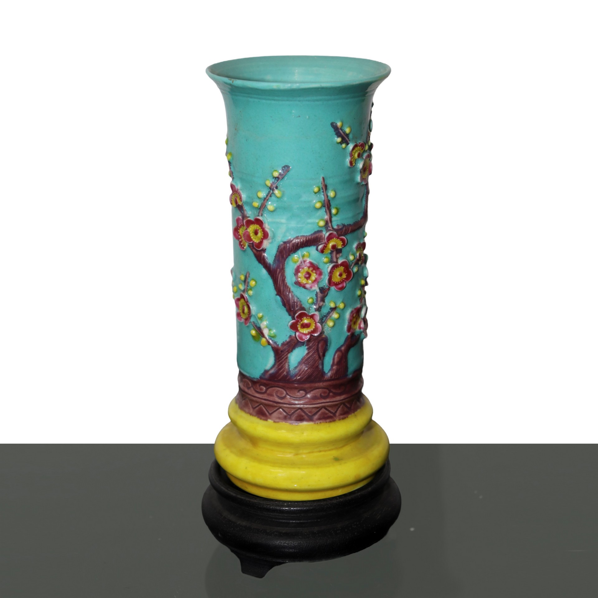 Vaso orientale a rullo cilindro in porcellana smaltata, Dinastia Quinq Famiglia Rosa, 19° secolo H cm 14.5x6.5 - con base H 17.2x7.3 Vaso orientale a forma cilindrica in porcellana, a sfondo verde acqua, base smaltata in giallo, decorato con albero in fiore. Base di legno. Leggere gocciolature della vernice verde acqua all'interno del vaso.Vaso orientale a forma cilindrica in porcellana, a sfondo verde acqua, base smaltata in giallo, decorato con albero in fiore. Base di legno. Leggere gocciolature della vernice verde acqua all'interno del vaso.