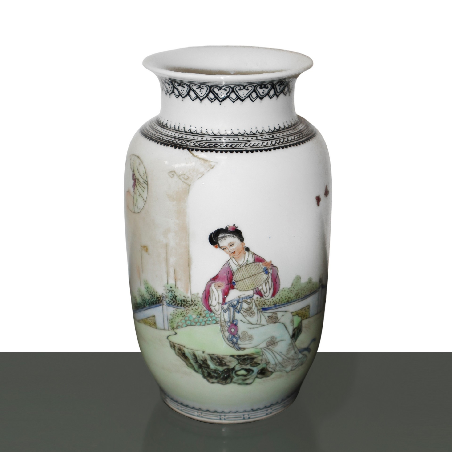 Vaso giapponese in porcellana bianca con raffigurazione di geisha
