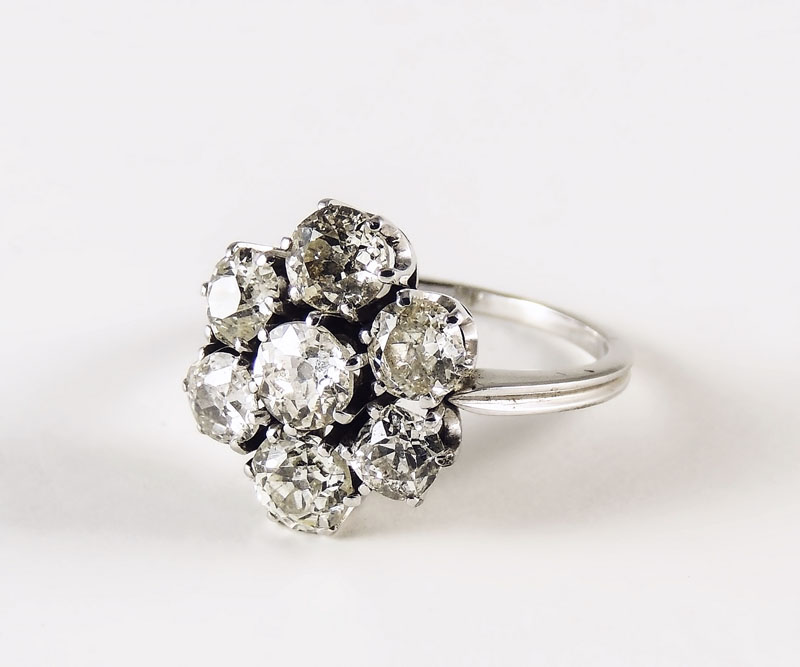 ANELLO A MARGHERITA IN ORO BIANCO E DIAMANTI Anni Sessanta realizzato con sette diamanti taglio brillante ct 1,40 circa, gr 5,7 WHITE GOLD AND DIAMOND RING, 1960S