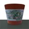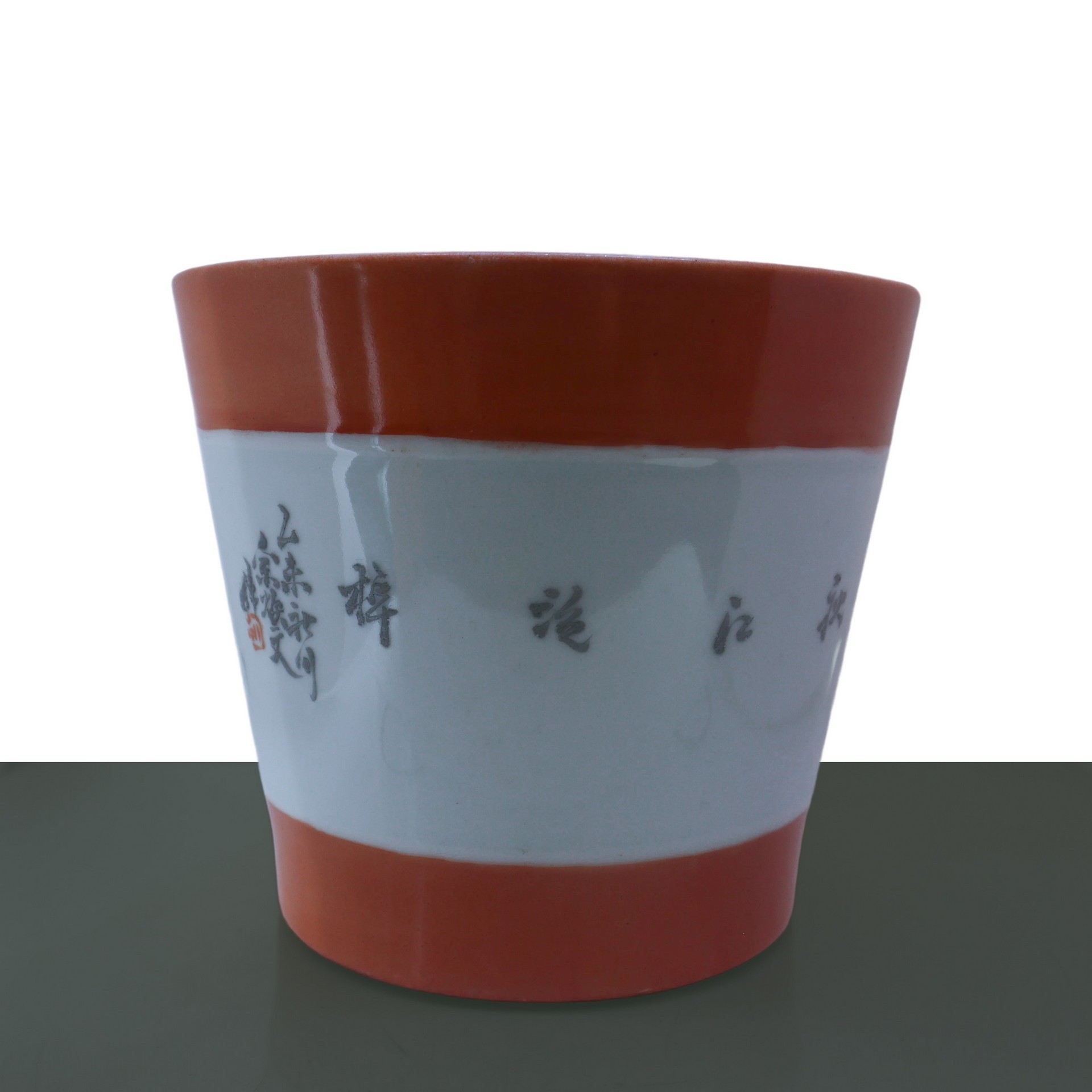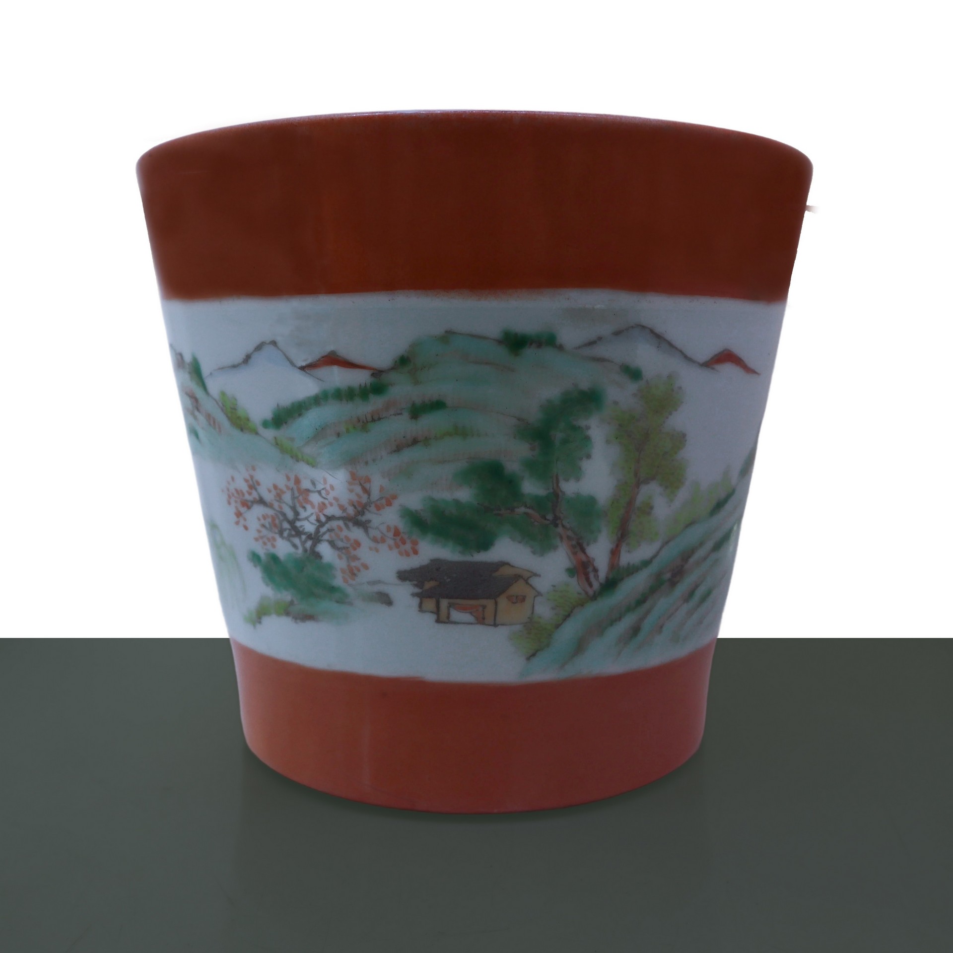 Vaso smaltato nei toni bianco e arancione con decori policromi, 19°/20° secolo h cm 15 x diametro cm 17