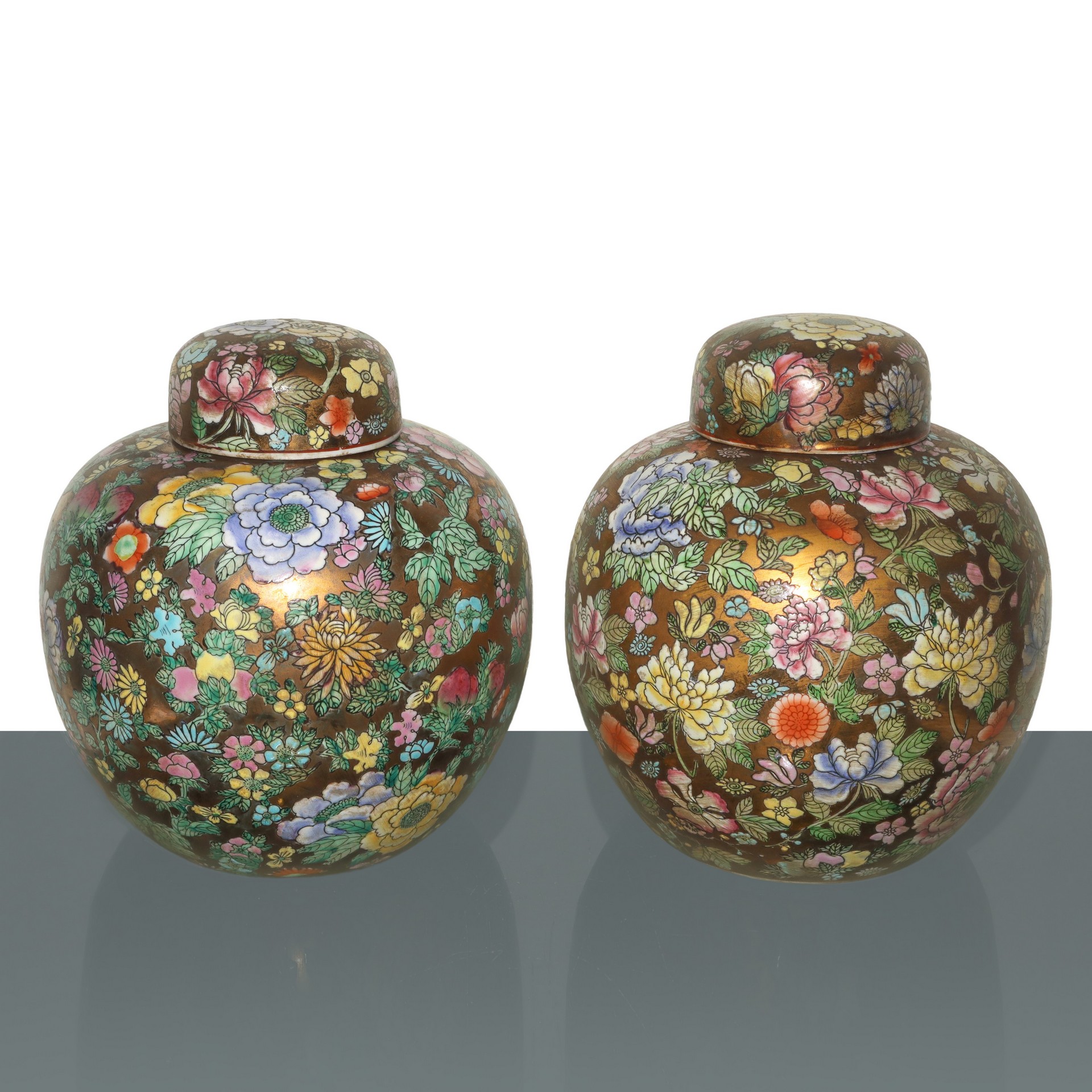 Coppia di poutiche cinesi con decori floreali in smalti policromi a rilievo