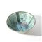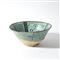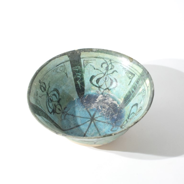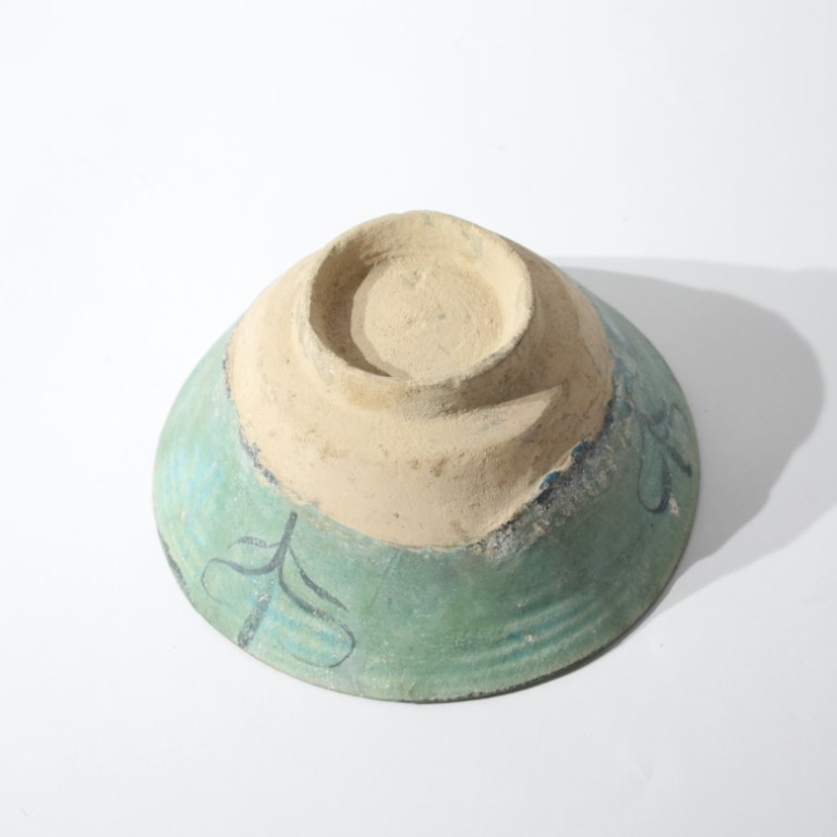 In pasta silicea, poggiante su disco. Dipinta in nero sottocoperta con palmette stilizzate inserite in spicchi delimitati da spesse bande scure. Ricoperta di invetriatura turchese, scoperto l'esterno della base.