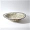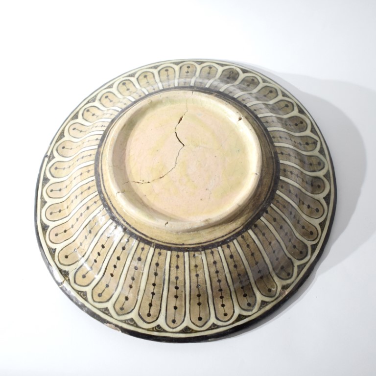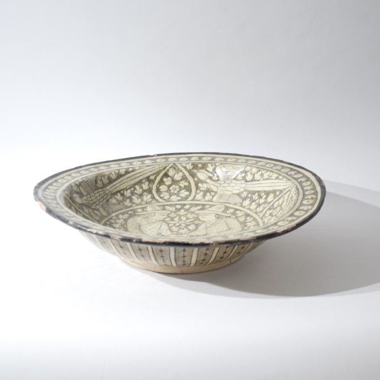 Grande piatto poggiante su disco, pareti delicatamente svasate e breve tesa estroflessa. L'interno tipicamente decorato in leggero rilievo con simiurgh nel cavetto, separati da riserve a forma di goccia contenenti motivo floreale, e coppia che si tiene per mano raffigurata nel tondo centrale. L'esterno dipinto con pannelli radianti contenenti decorazione puntinata.