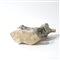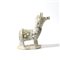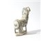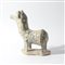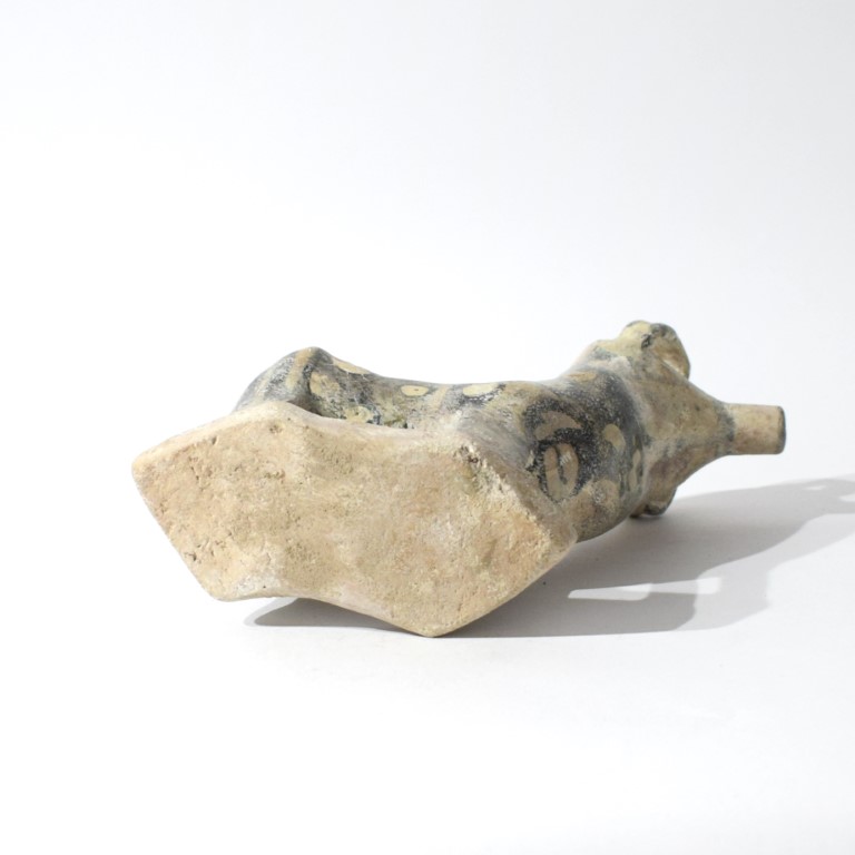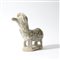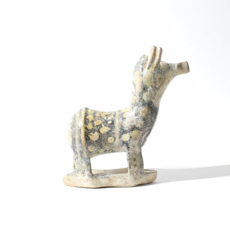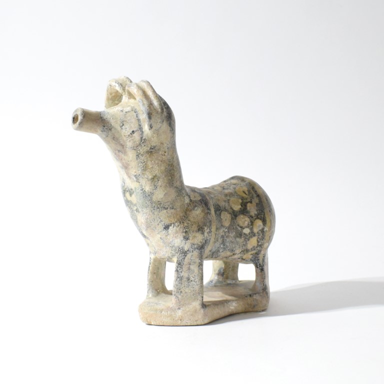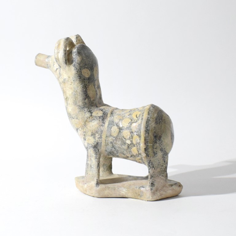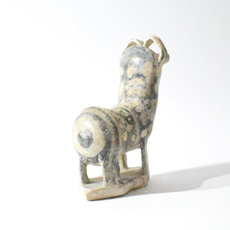 Figura di quadrupede, probabilmente un ariete, in pasta silicea lavorata a stampo parzialmente in rilievo e dipinta con motivo floreale in bianco bordato di nero risultante in un effetto ottico quasi maculato. La bocca dell'animale è sagomata a versatoio.