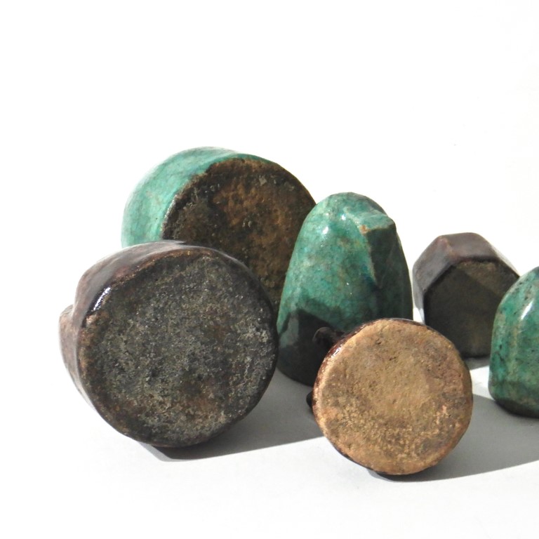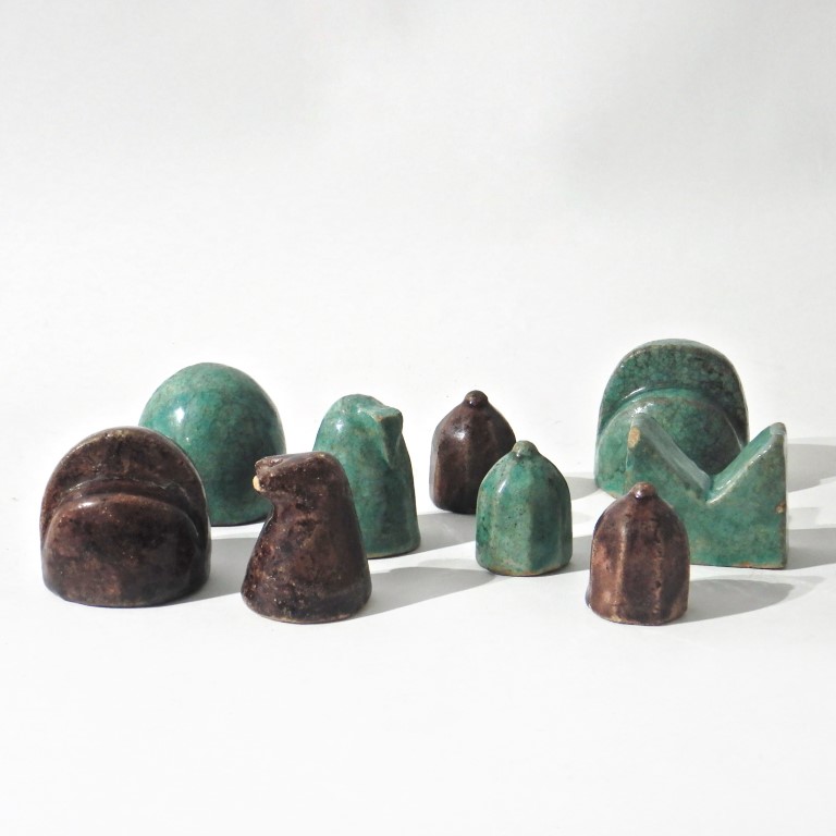 In pasta silicea invetriata di azzurro o bruno e lavorata a stampo a raffigurare: Un re, identificabile con la sagoma di un trono, due Vizier, equivalenti alla regina e simboleggiati dai seggi più piccoli rispetto a quello del re un elefante, equivalente dell'alfiere, caratterizzato dalle due protrusioni che richiamano le zanne tre pedoni, a cupola con corpo sfaccettato il carro, equivalente della torre e un cavallo. Il gioco degli scacchi ha origine in India nel VI-VII secolo d.C. dove veniva chiamato caturanga, e rappresentava le quattro divisioni dell'esercito (fanteria, cavalleria, elefanti, carri). In breve il gioco di strategia si diffuse verso ovest e venne adottato nell'Impero sasanide (Persia) con il nome chatrang, diventando parte dell'educazione principesca. Dopo la conquista islamica della Persia nel VII secolo, il gioco prese il nome di shatranj e adottò forme sempre più stilizzate e aniconiche per rispettare il divieto religioso di raffigurare esseri viventi.