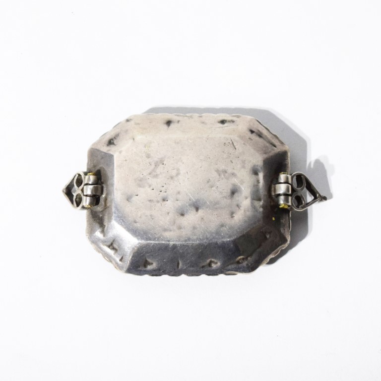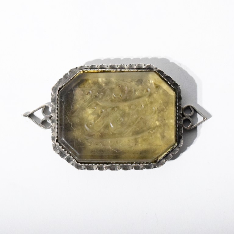 Talismano gioiello montato in argento e realizzato probabilmente in vetro da impatto meteoritico formatosi nel deserto libico nella zona periferica ad est del Sahara. Questo vetro naturale denominato comunemente LDG (Libian Desert Glass) si caratterizza per il particolare colore giallo pallido. Sin dalla remota antichità è stato sfruttato per la creazione di importanti gioielli e manufatti nonché impiegato come preziosa merce di scambio commerciale.