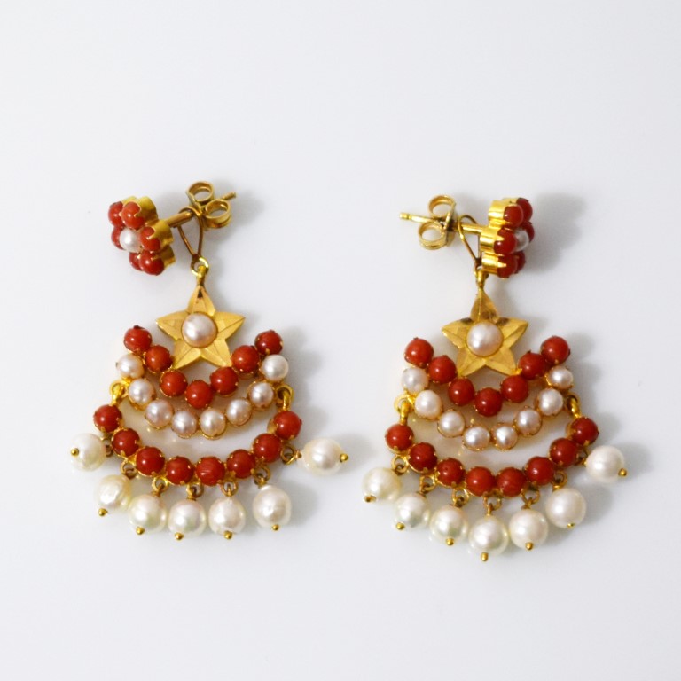 Coppia di orecchini pendenti con montatura in oro a 22kt a tre strati alternati con perle e coralli e piccole perle pendenti in finale. Attaccatura a lobo sagomata a fiore con petali di corallo e raccordo tra lobo e pendenti in forma di fiore dorato con perla centrale.