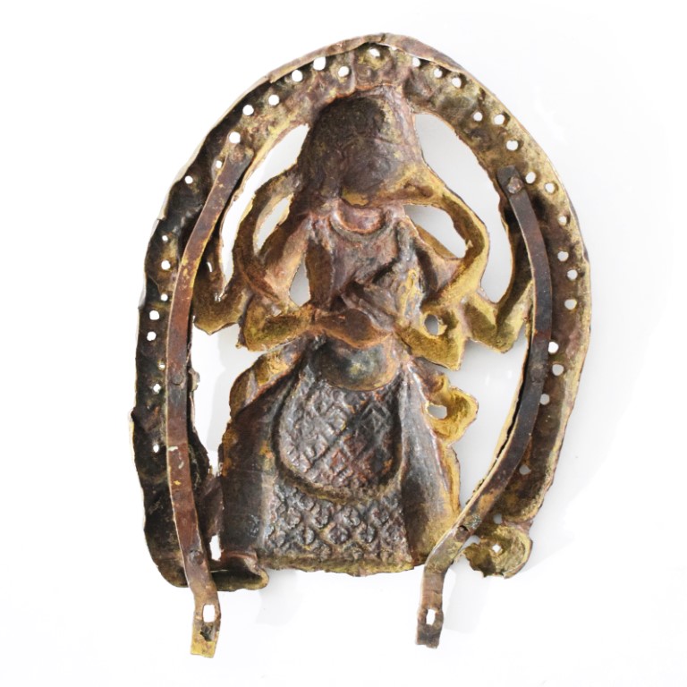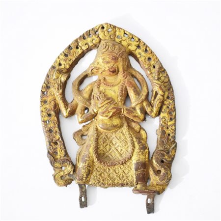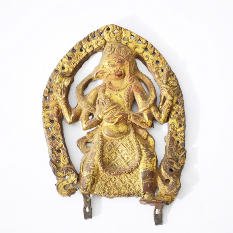Elemento di altare devozionale in lamina di rame sbalzato e dorato raffigurante la cavalcatura di Vishnu, caratterizzato dal corpo antropomorfo e la testa da uccello. Garuda è qui raffigurato nelle sua versione a quattro braccia, le due secondarie reggono il tamburo (damaru) e lo scettro (khatvanga) come attributi e le due principali la ciotola (Kapala). La figura indossa abiti regali, la corona a cinque punte ed è circondata da un'aureola fiammeggiante.
