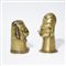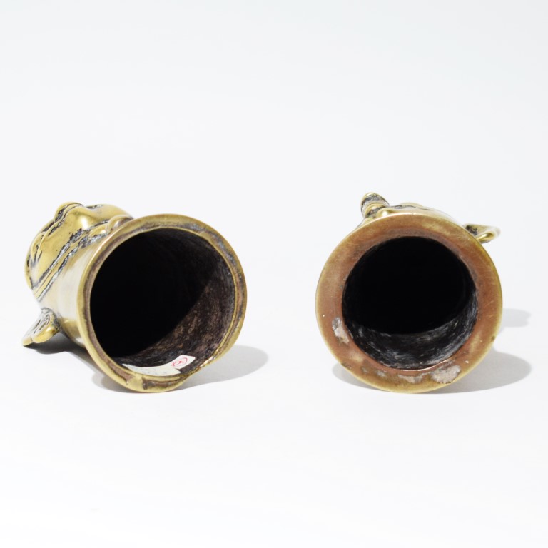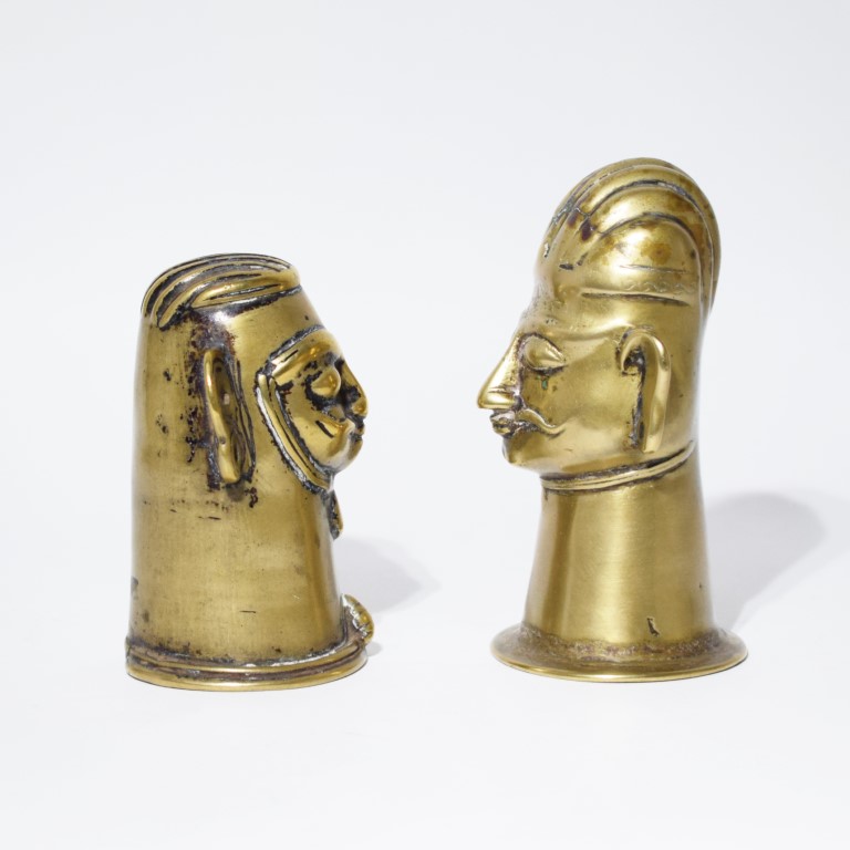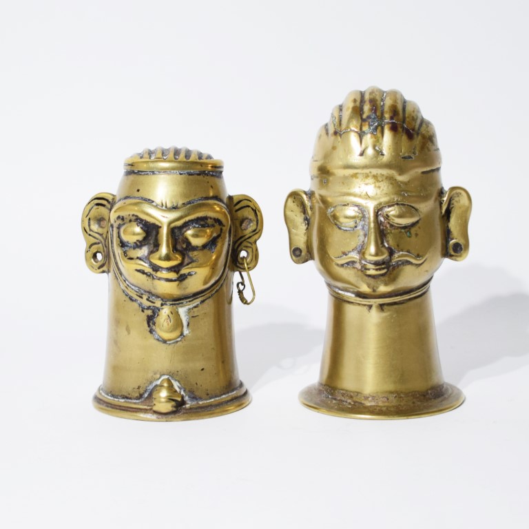Fusioni in metallo raffiguranti la forma aniconica di Shiva (lingam) da cui emerge il volto della divinità. Il più basso (h. 10 cm) è accessoriato con un orecchino ad anello passante per il foro del lobo sinistro e un piccolo Shivalinga applicato sulla base. Il più grande mostra uno sguardo più sereno ed un'alta capigliatura.