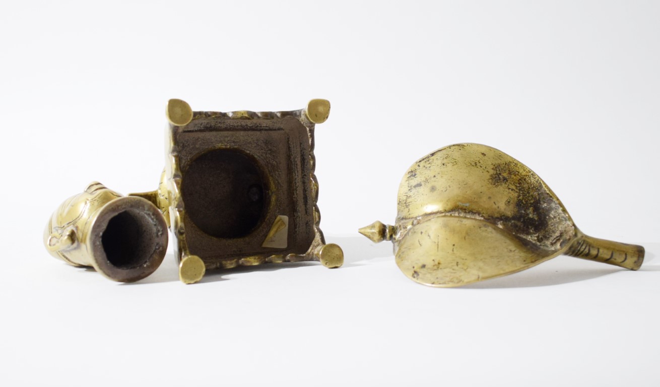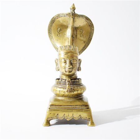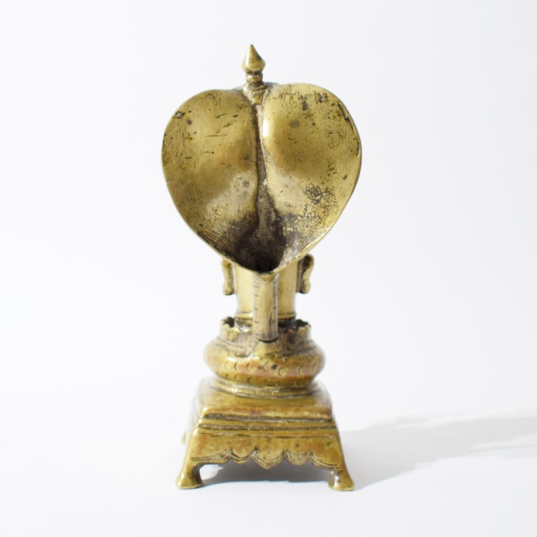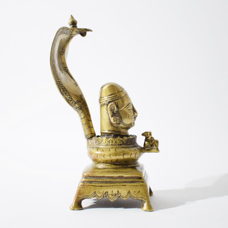 Fusione raffigurante la forma aniconica di Shiva (lingam) da cui emerge il volto della divinità, adagiato tra le spire di un grande serpente (naga), riconoscibile dalla grande testa che funge da sfondo e aureola a Shiva. Davanti alla divinità porge i suoi omaggi un piccolo Nandi, il toro veicolo di Shiva.