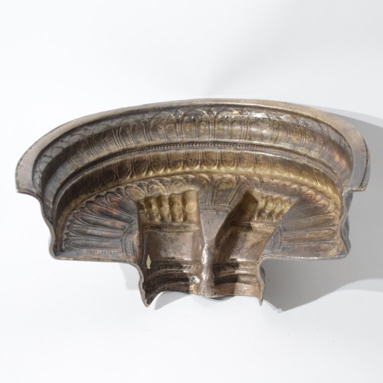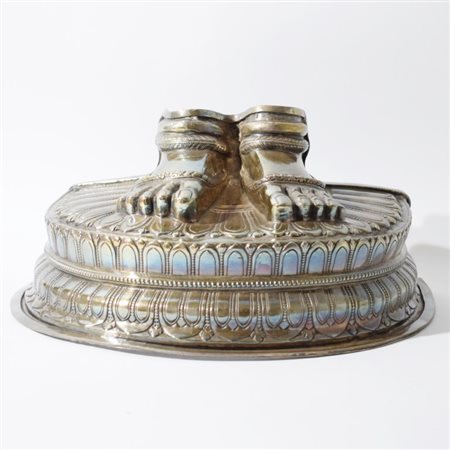 Lamina in argento battuto raffigurante i piedi di una divinità hindu, identificabile con Vishu per la posizione degli arti e per la raffinatezza dei gioielli che li adornano, tipici di Vishnu 'Signore del Mondo' (Jagannatha).