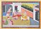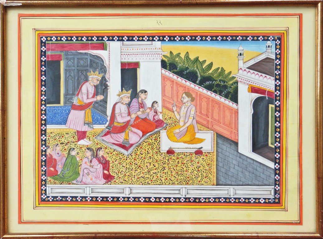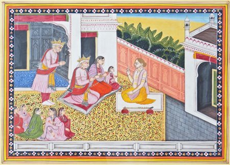 Dipinto nello stile di Kangra o Guler raffigurante una famiglia reale in preghiera di fronte ad un asceta sulla terrazza di un edificio in marmo bianco. I personaggi sono seduti su un tappeto floreale su fondo giallo e sono accompagnati da cinque attendenti in basso a sinistra.