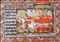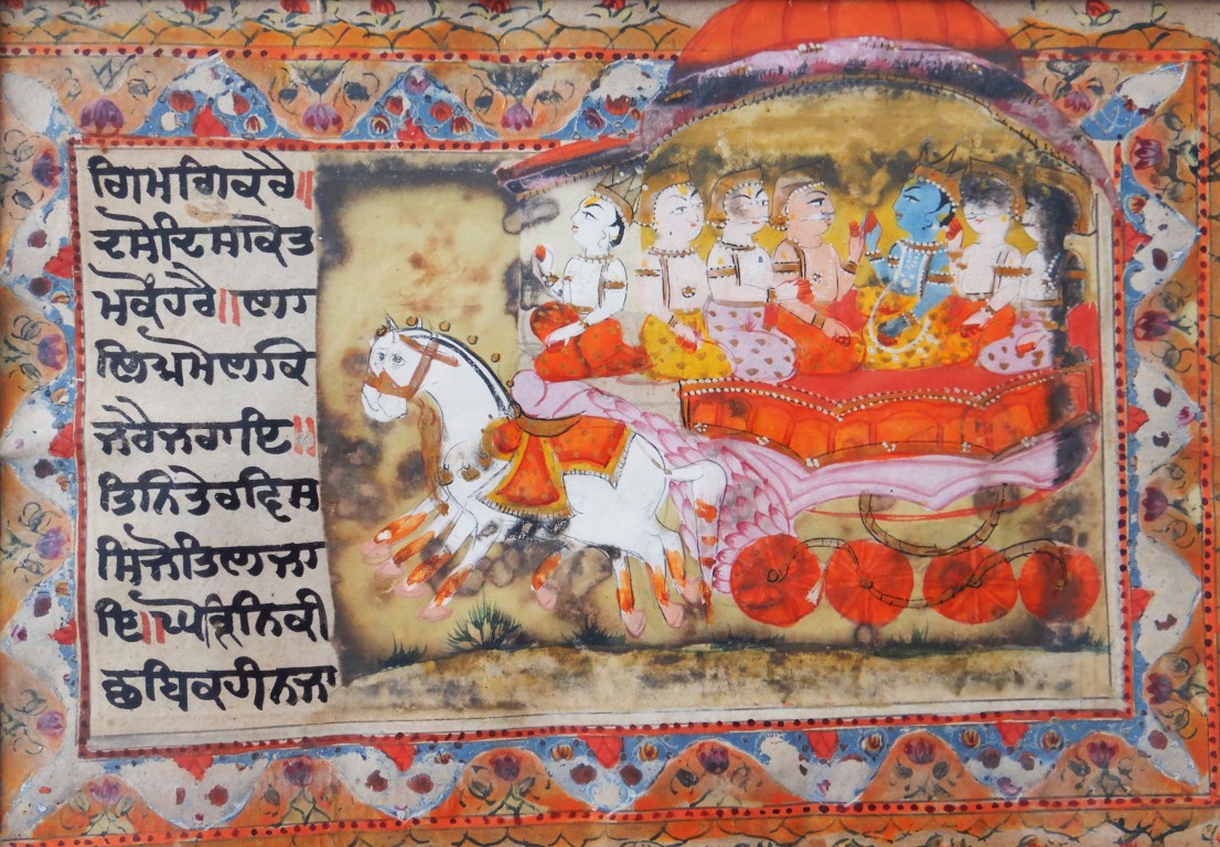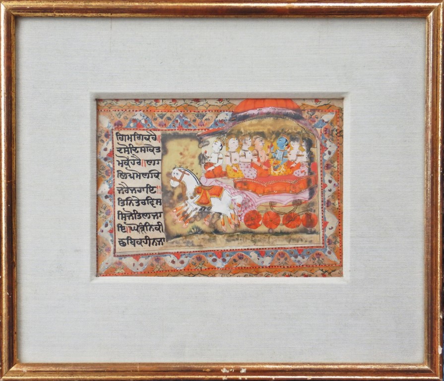 pagina di manoscritto devozionale raffigurante un carro cerimoniale trainato da due cavalli e sormontato da palanchino con divinità hindu. 9 linee di testo in devanagari a fianco e cornice con illuminazione floreale. Inchiostro, pigmenti e oro su carta.