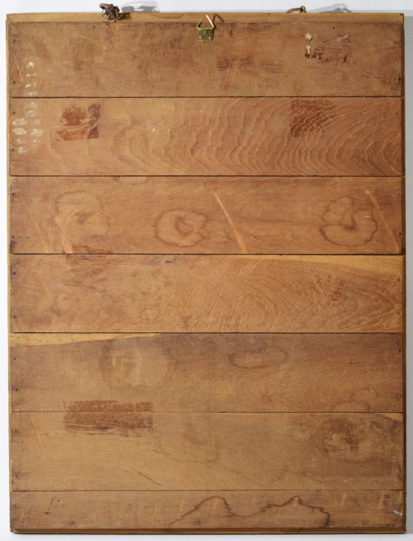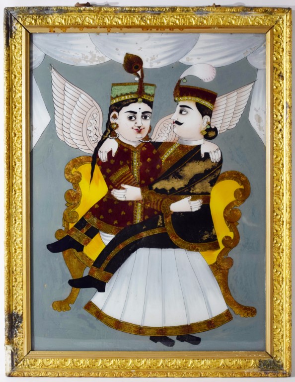 Curioso dipinto in stile coloniale raffigurante una coppia su una poltrona di fattura europea. La probabile ascendenza divina della coppia effigiata è simboleggiata dalle ali e dagli attributi sui copricapi, in particolare la piuma di pavone su quello della donna. Al contrario l'uomo indossa un'uniforme occidentale.