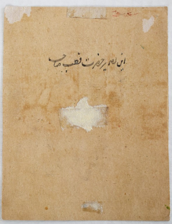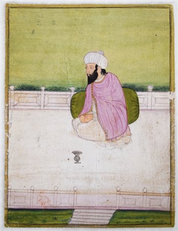 Gouache e oro su carta, raffigurante un religioso nel padiglione esterno di un palazzo. Il personaggio indossa un ampio turbante e una sobria veste con profili dorati. Un'iscrizione in persiano sul retro recita 'Questa è l'immagine del sig. Qorb Saheb' dove Saheb identifica un titolo onorifico generico molto diffuso in India.
