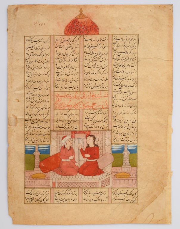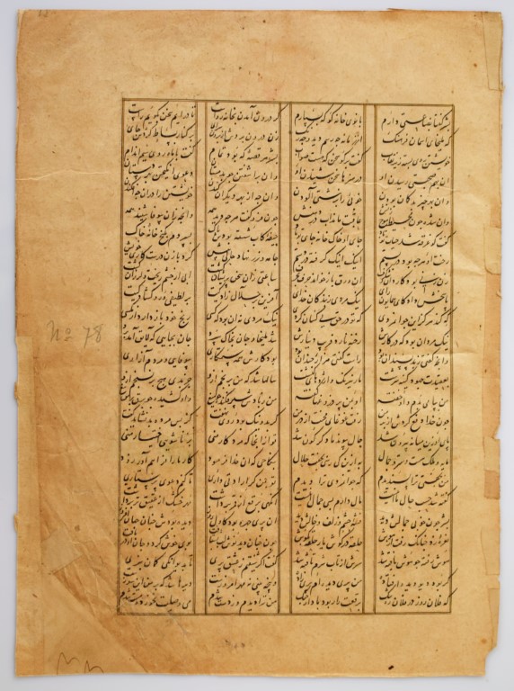 Testo in persiano su carta, vergato in inchiostro nero con titoli in rosso, arrangiato su 4 colonne, contenenti 18 linee in calligrafia nasta'liq. Il passaggio qui illustrato narra delle vicende del re Sasanide Bahram Gur contenute nel celebre poema dell'autore azero.