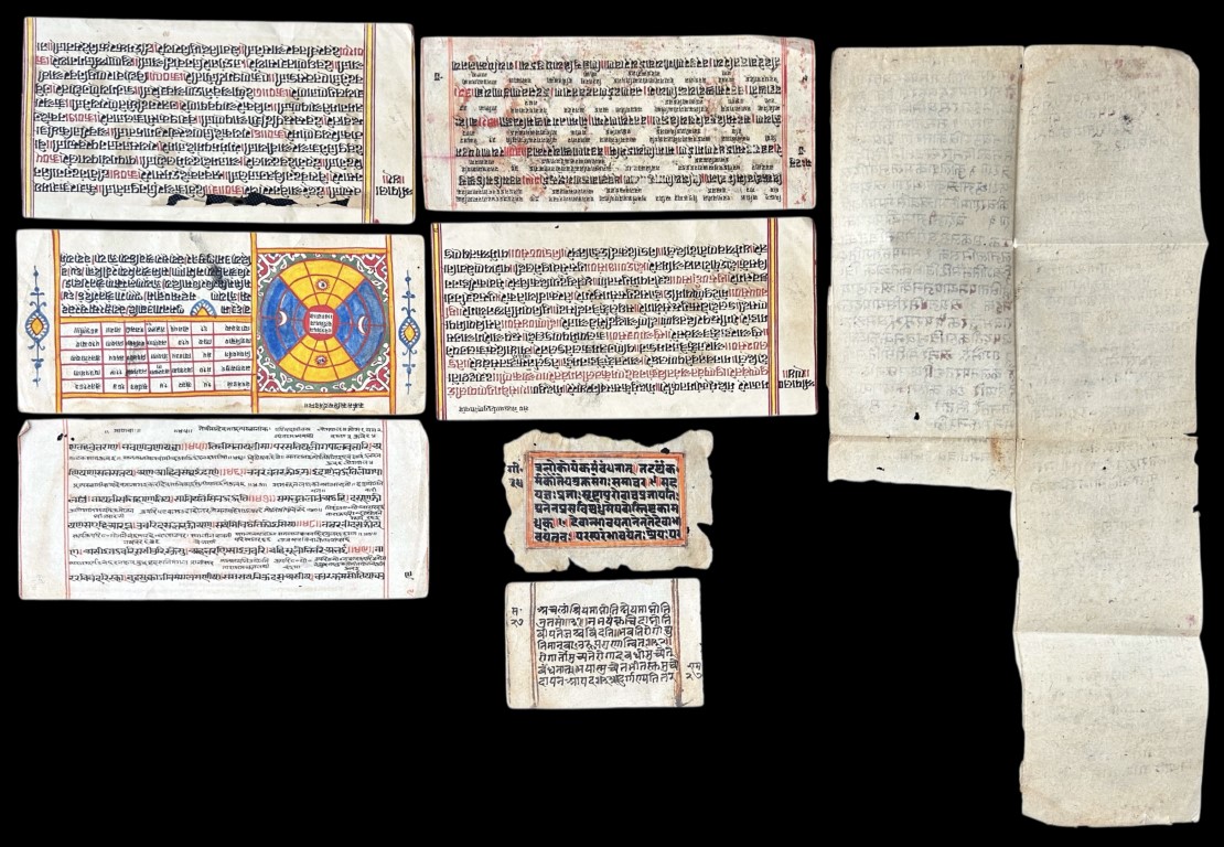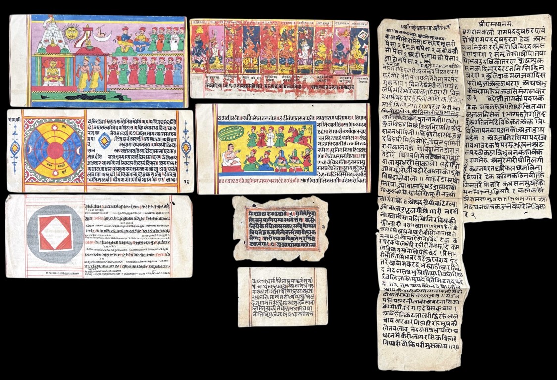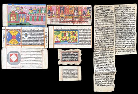 Gruppo eterogeneo di pagine miniate tratte da manoscritti dispersi. Tutte recano iscrizioni in caratteri devanagari con inchiostro nero. Tra le illustrazioni si distinguono: