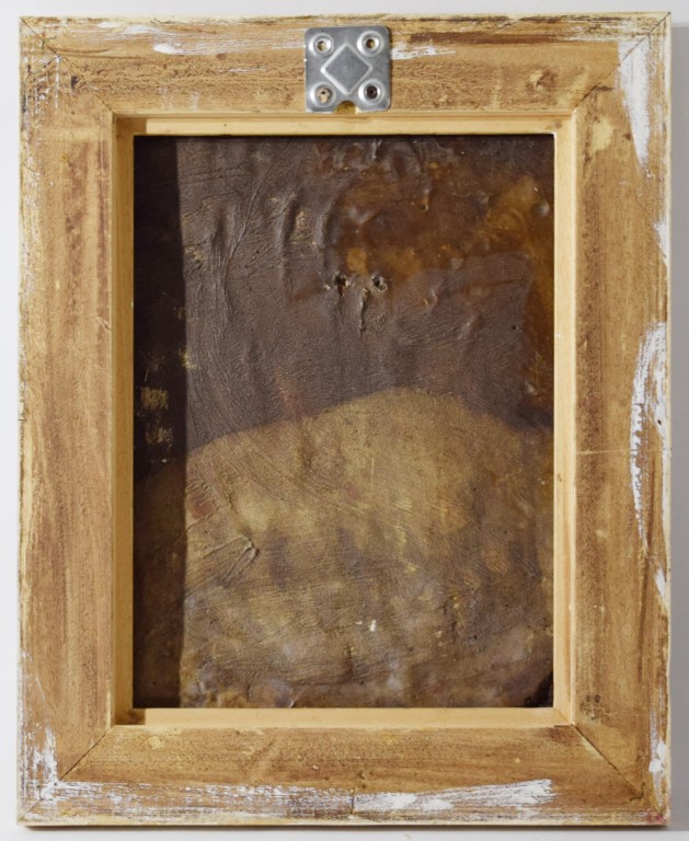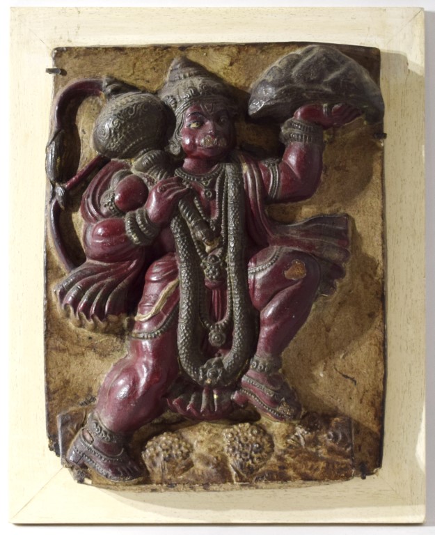 Placca in stucco policromo raffigurante la divinità con il volto di scimmia, corredata dai classici attributi: la montagna Dronagiri retta dalla sua mano sinistra e la mazza (gada) impugnata dalla mano destra.