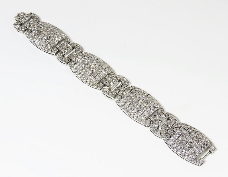 BRACCIALE A PIASTRE IN ORO BIANCO E DIAMANTI realizzato in in stile Decò con diamanti taglio brillante rotondo ct 8,50 circa complessivi, gr 58,4 WHITE GOLD AND DIAMONDS BRACELET