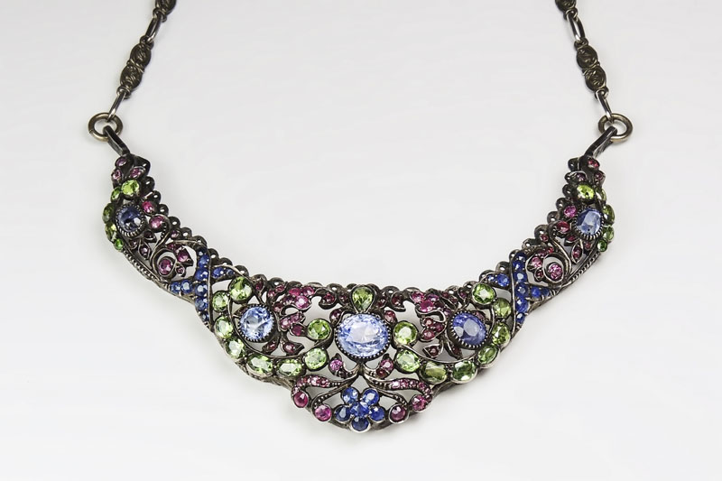 CHIUSURA PER BORSETTA IN ARGENTO E PIETRE PREZIOSE NATURALI fine del XIX/inizio del XX secolo corredata di catena, con zaffiri, rubini e granati demantoidi, tra cui i cinque zaffiri più grandi non presentano trattamento termico gr 54,8 SIVER AND PRECIOUS POCHETTE CLOSURE