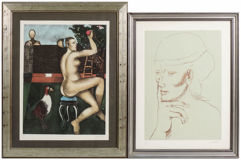 RANCO GENTILINI (1909-1981) Paesaggio con nudo femminile Ritratto di donna un'acquatinta ed una litografia, prova d'autore e es 6/70, firmati, in cornice cm 62x47, cm 62x44 (2) LANDSCAPE WITH A FEMALE NUDE AND FEMALE PORTRAIT AN AQUATINT AND A LITHOGRAPH