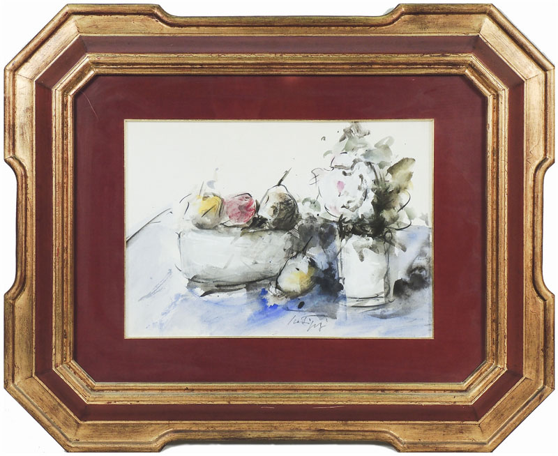SERGIO SCATIZZI (1918-2009) Natura morta con frutta e vaso di fiori acquerello su carta, firmato, in cornice cm 34x47 STILL LIFE WITH FRUITS AND VASE OF FLOWERS, WATERCOLOUR ON PAPER