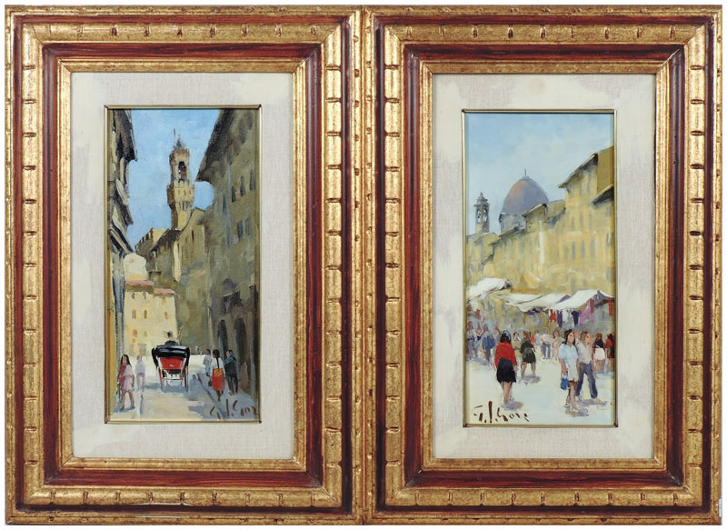 GINO PAOLO GORI (1911-1991) Via dei Neri e Mercato di San Lorenzo coppia di dipinti ad olio su tela, firmati, al verso firmati e titolati, in cornice cm 40x20 Florence Views, a pair of oils on canvas
