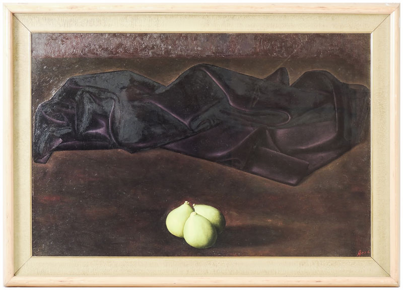 GIOVANNI ACCI (1910-1979) Natura morta con panneggio e fichi olio su faesite, firmato, in cornice cm 53x80 STILL LIFE WITH DRAPERY AND FIGS, OIL ON FAESITE