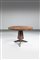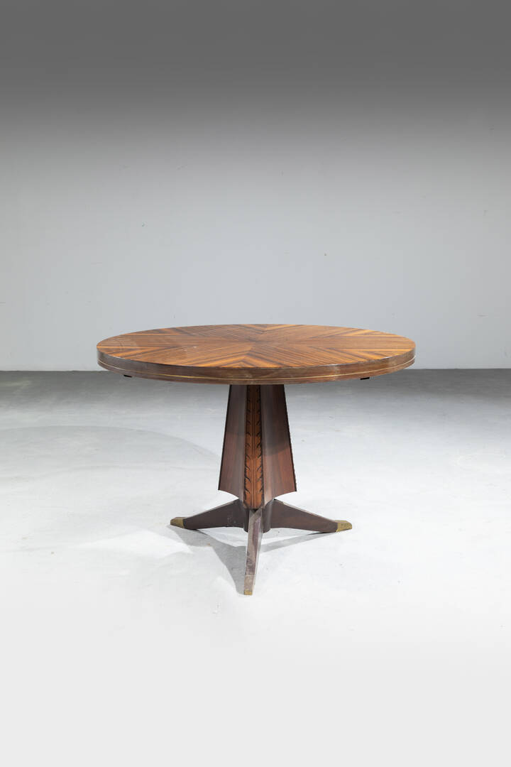 Tavolo in legno con profili in ottone, sostegno centrale decorato a motivo di foglie.