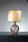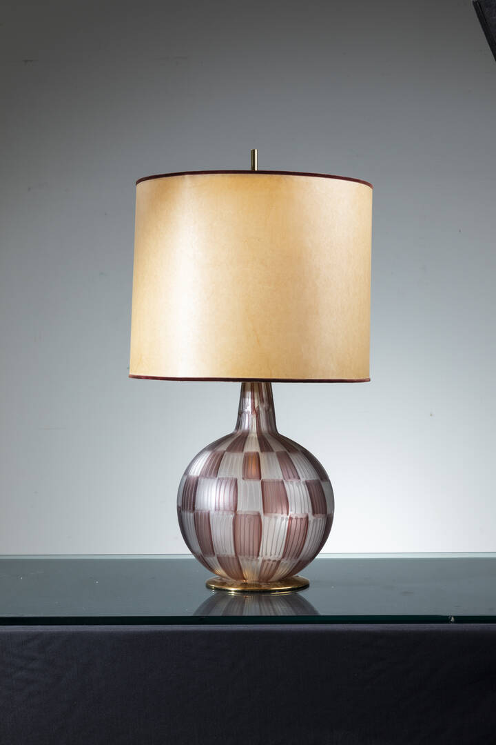 Struttura in ottone, vetro soffiato di Barovier e Toso; paralume in carta.