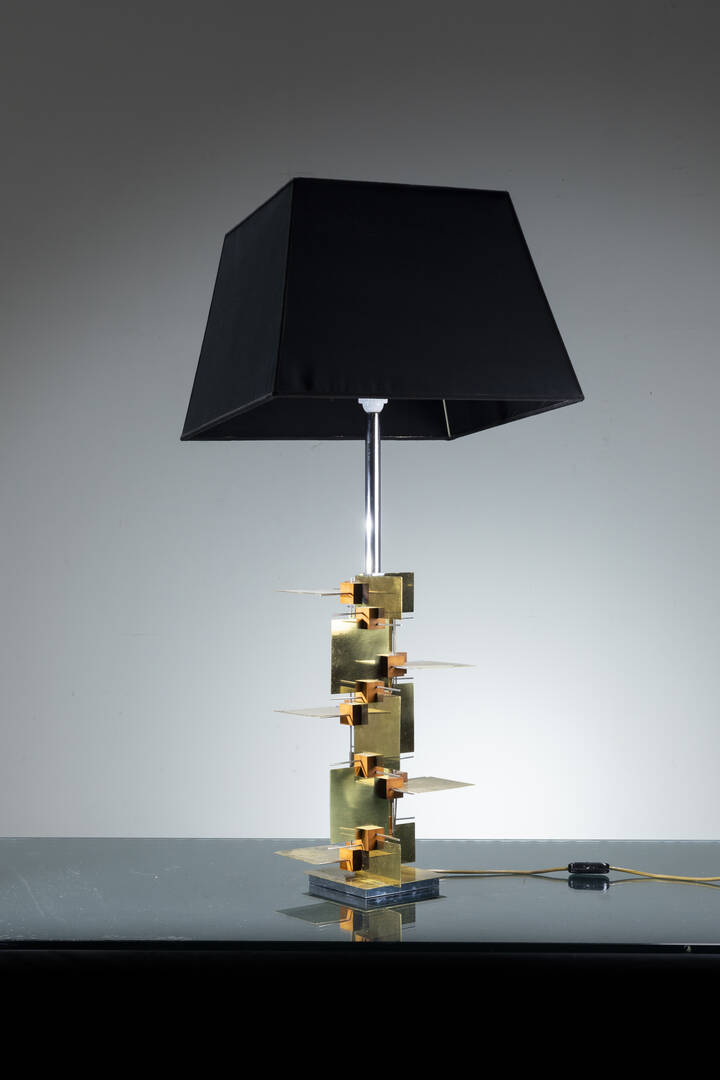 Struttura in acciaio e ottone, paralume in tessuto e particolari in legno.