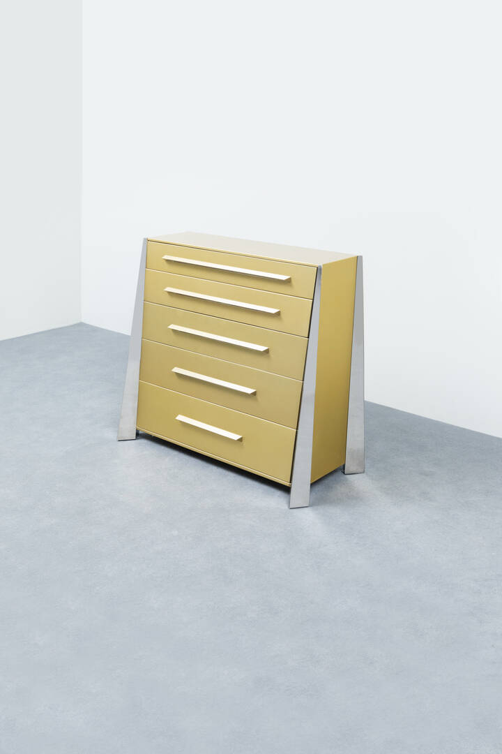 Cassettone a cinque cassetti, laccato oro, gambe e maniglie in acciaio.