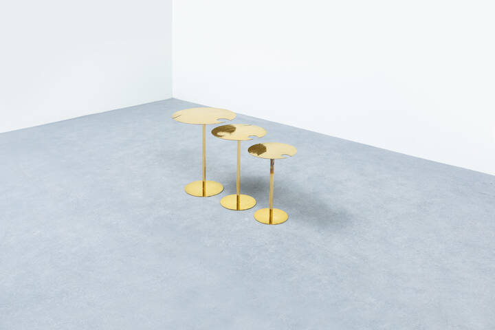 Tre tavolini in ottone battuto a mano con profili naso, bocca e occhio.