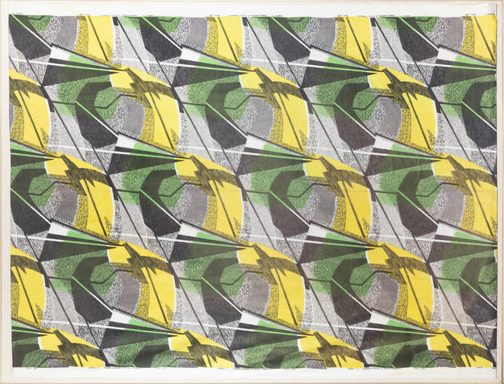 137,5x180,5, cotone stampato a mando su disegno di Enrico Prampolini dalla manifattura Jsa di Busto Arsizio (Varese).