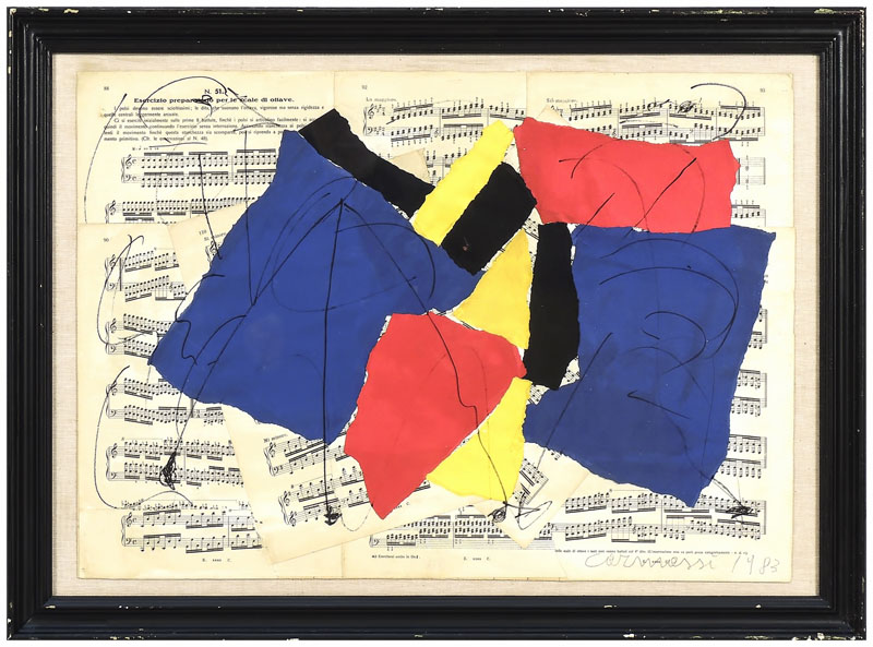 ARTURO CARMASSI Composizione con spartiti musicali 1983 tecnica mista e collage su carta, firmato e datato, in cornice cm 45x62 Corredato di autentica dell'autore su fotografia COMPOSITION WITH SHEETS MUSIC, MIXED MEDIA AND COLLAGE ON PAPER