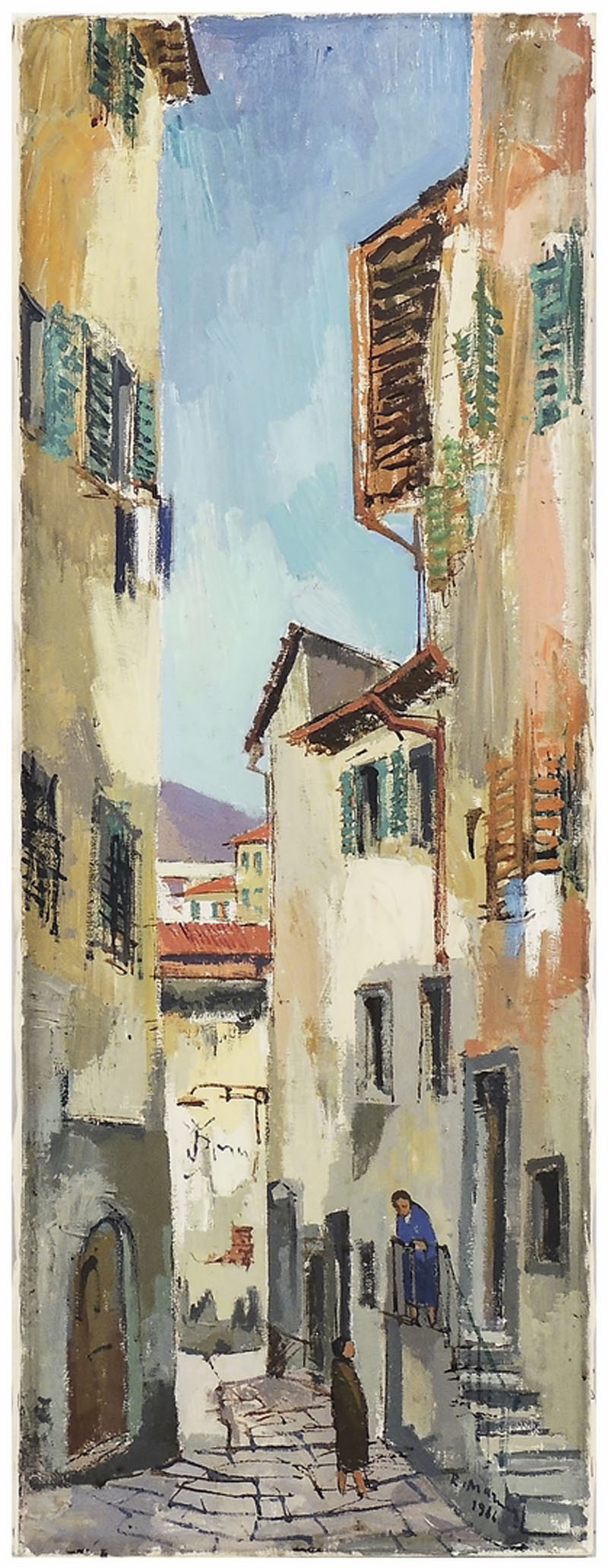 RODOLFO MARMA (1923-1999) Pontassieve Vicolo del Porticciolo 1966 olio su tela, firmato e datato, al verso firmato, titolato e datato cm 80x30 PONTASSIEVE VIEW, OIL ON CANVAS