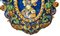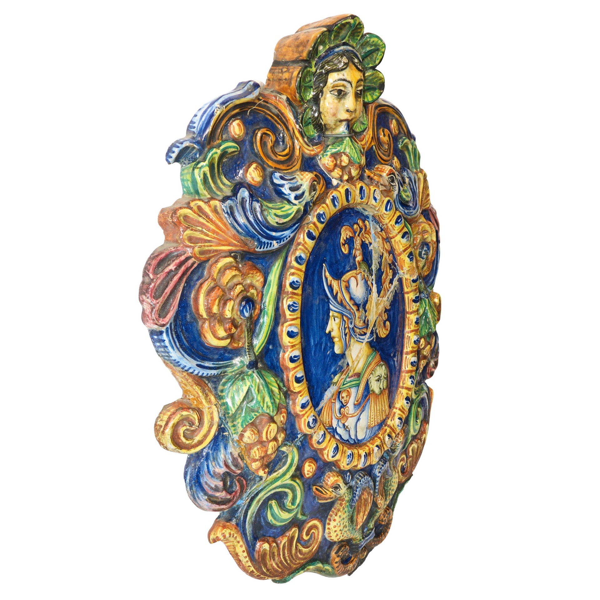 Medaglione in ceramica di Caltagirone policroma e decorata in rilievo con frutti e motivi zoomorfi con figura di paladino al centro, primi 20° secolo