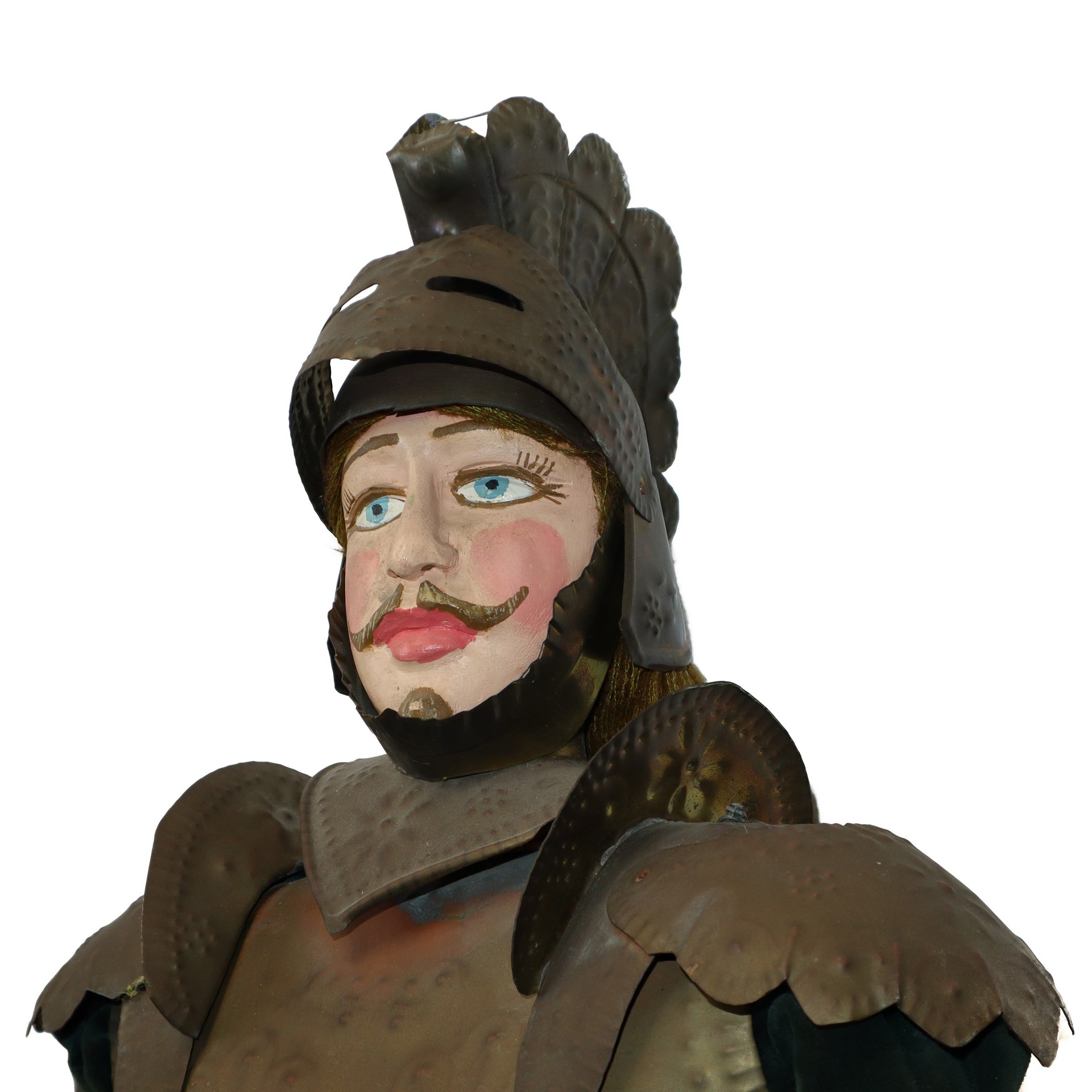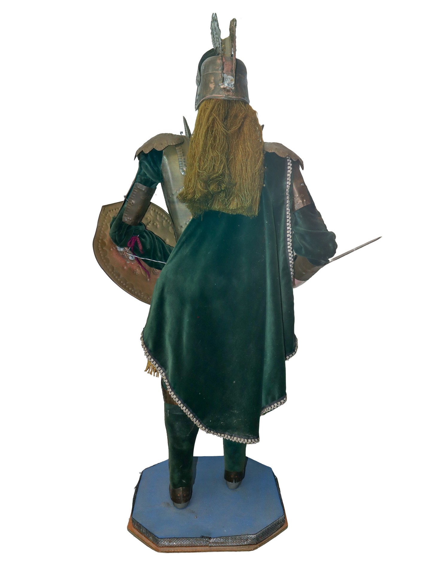 Pupo siciliano con armatura in metallo bronzata e indumenti in velluto verde h cm 95 Il pupo poggia su una base rivestita di velluto blu Il pupo poggia su una base rivestita di velluto blu