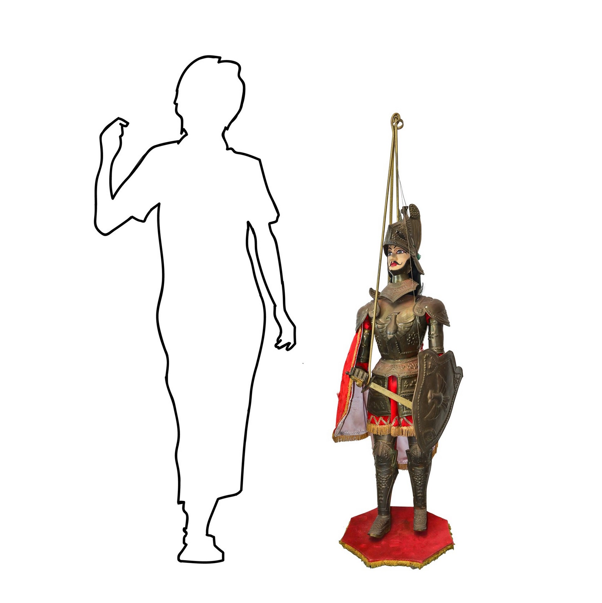 Pupo di Sicilia con armatura in metallo bronzato e vestiti e mantello rosso h cm 155 Il pupo poggia su una base ottagonale rivestita in velluto rosso Il pupo poggia su una base ottagonale rivestita in velluto rosso