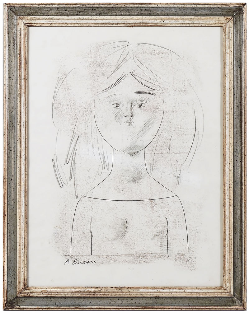 ANTONIO BUENO (1918-1984) Ritratto di fanciulla monotipo con base stampata e disegno a matita a su carta, firmato, in cornice cm 42,5x32,5 FEMALE PORTRAIT, MIXED MEDIA ON PAPER