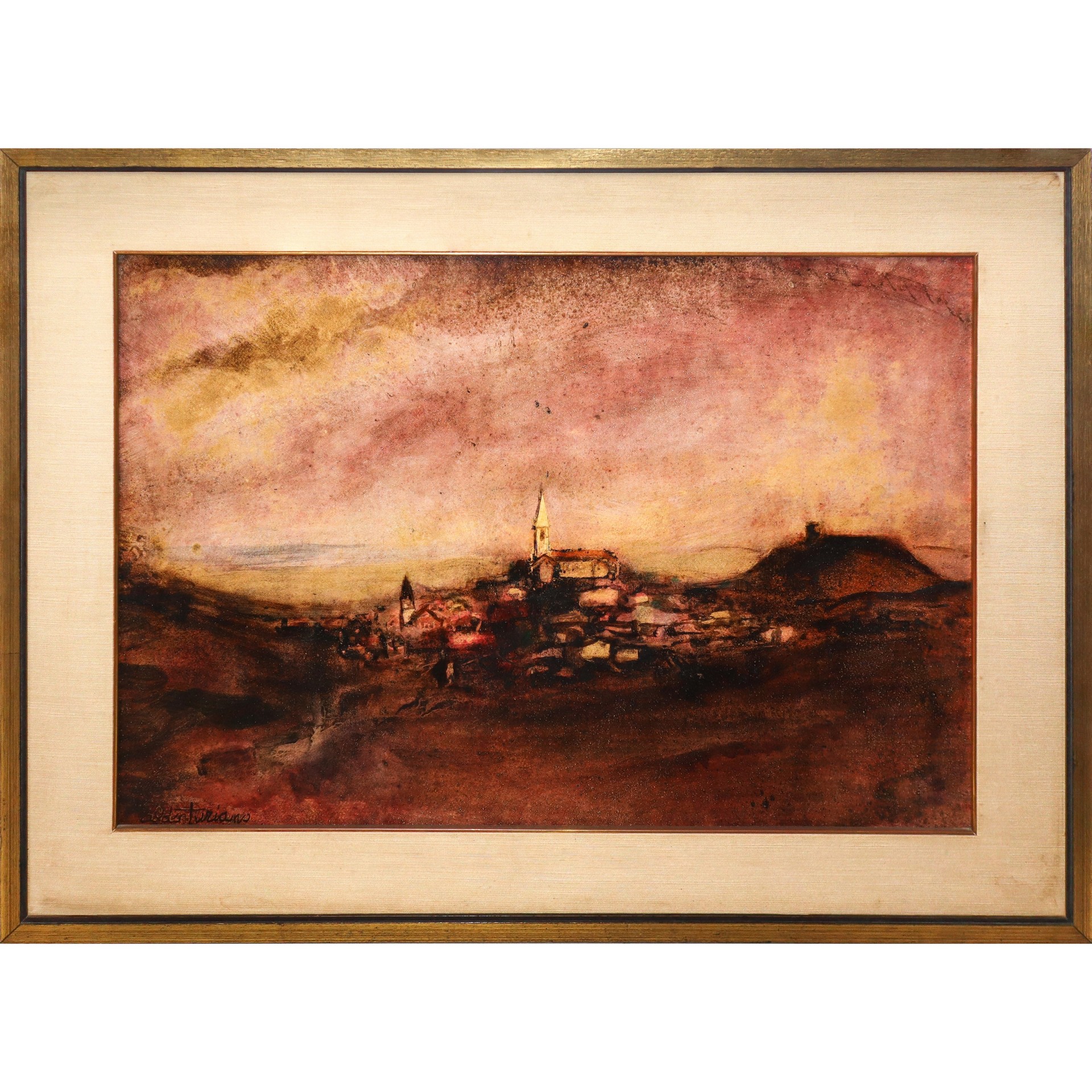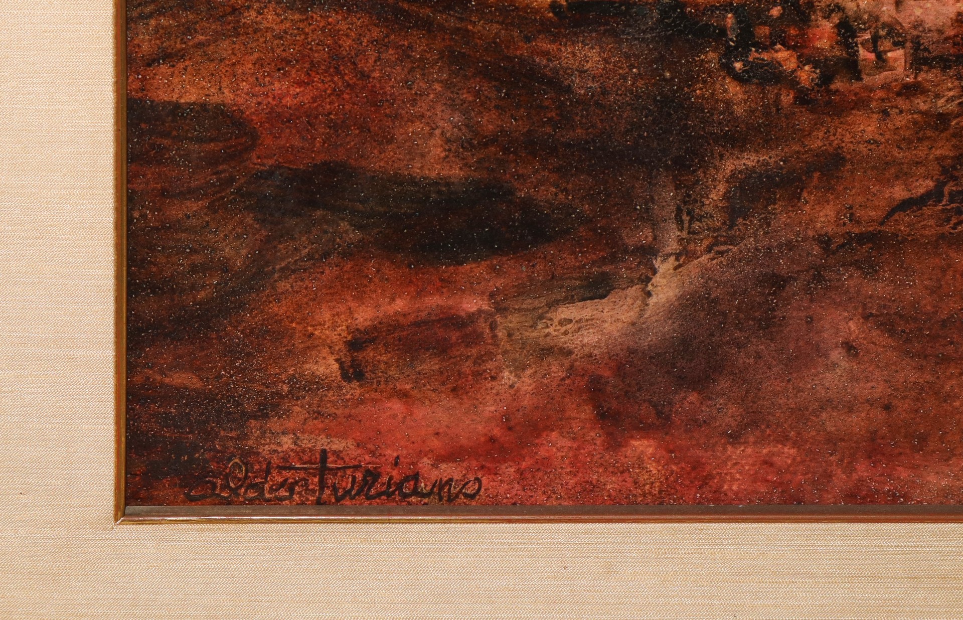 Aldo Turiano (catania 1938 - 2020) - Trecastagni h cm 53x73 in cornice h cm 67X87 olio su truciolato Firmato in basso a sinistra. Titolato sul retro, timbro della galleria sul retro in alto a destra