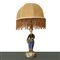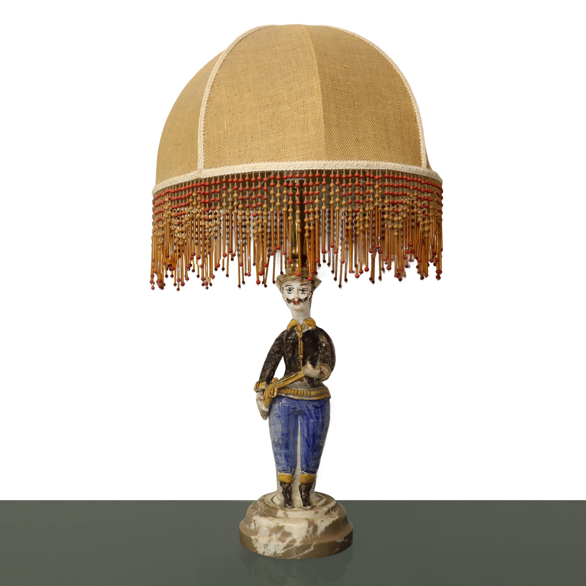 Lumiera in maiolica di Caltagirone con paralume in tessuto e base in marmo, metà 20° secolo