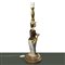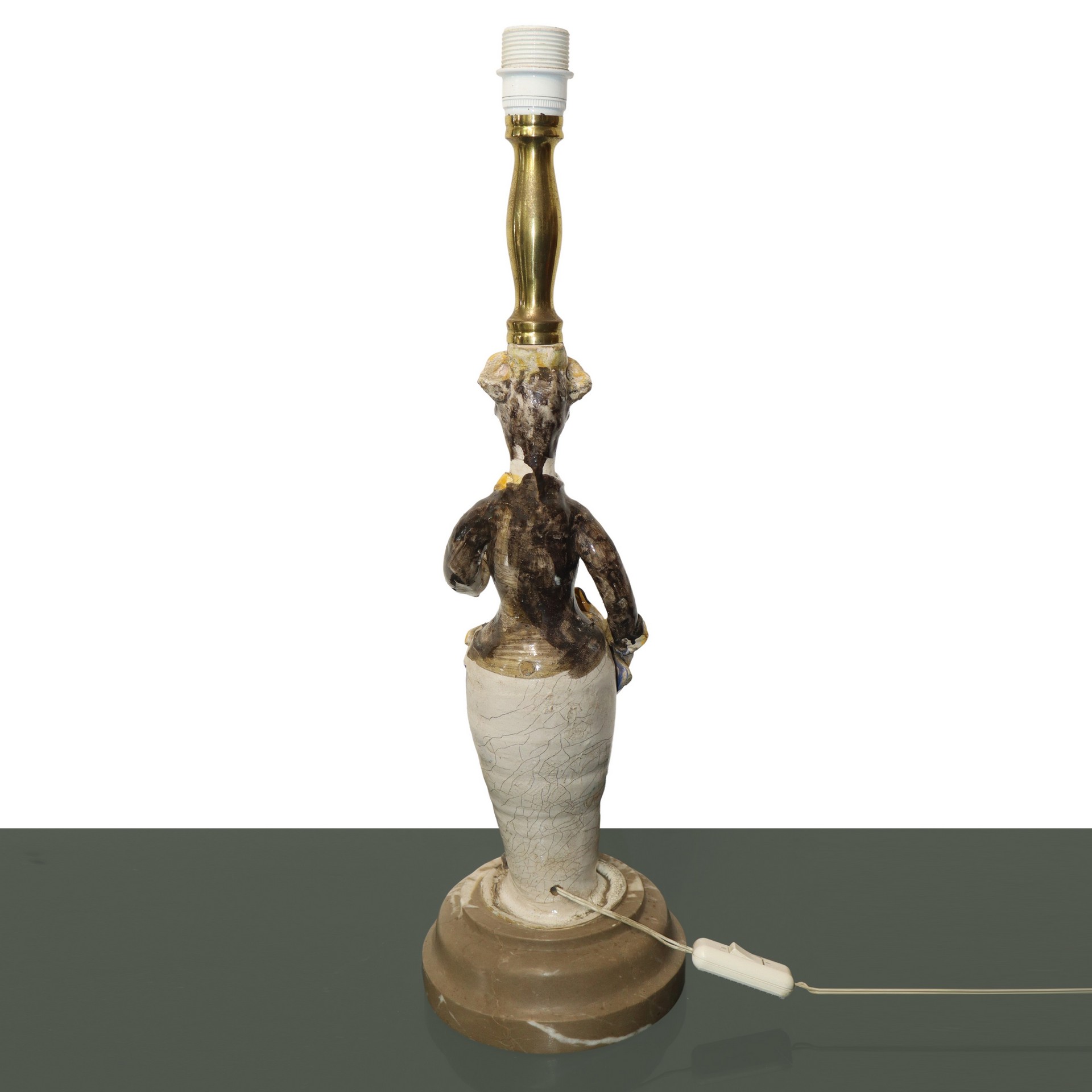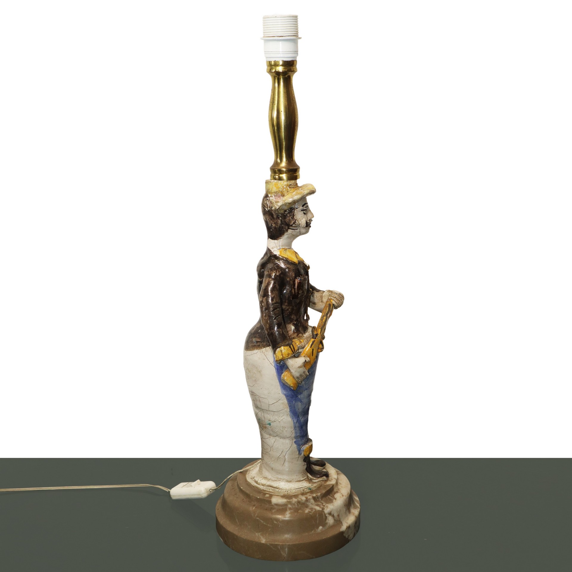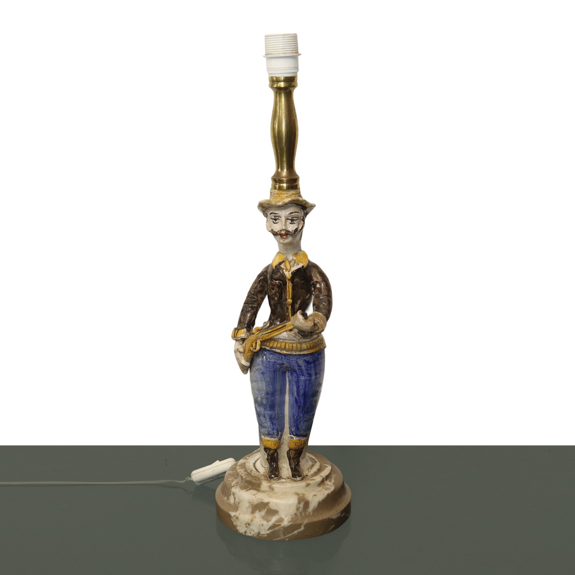 Lumiera in maiolica di Caltagirone con paralume in tessuto e base in marmo, metà 20° secolo h cm 80 Punta del fucile con piccola rotturaPunta del fucile con piccola rottura